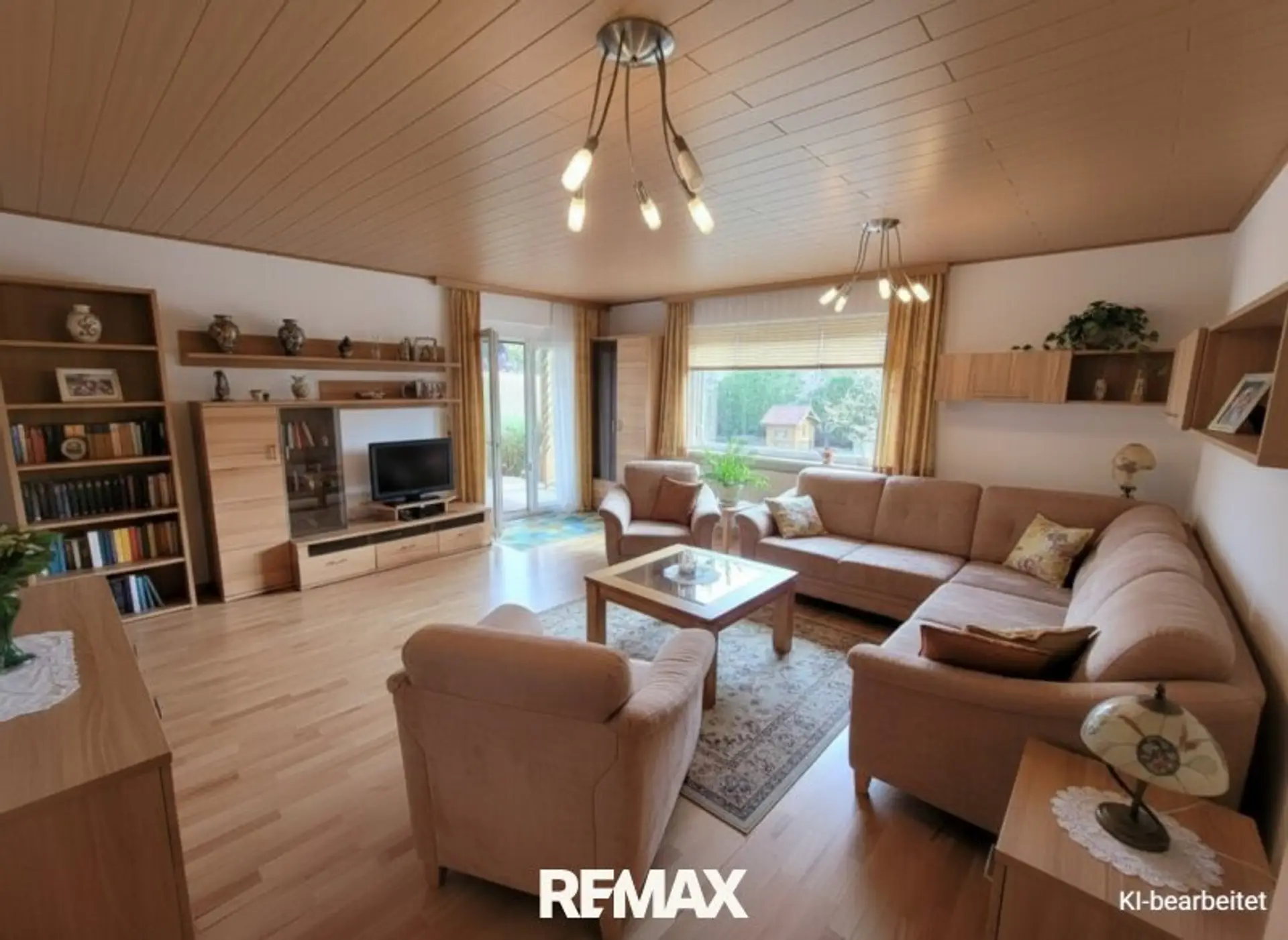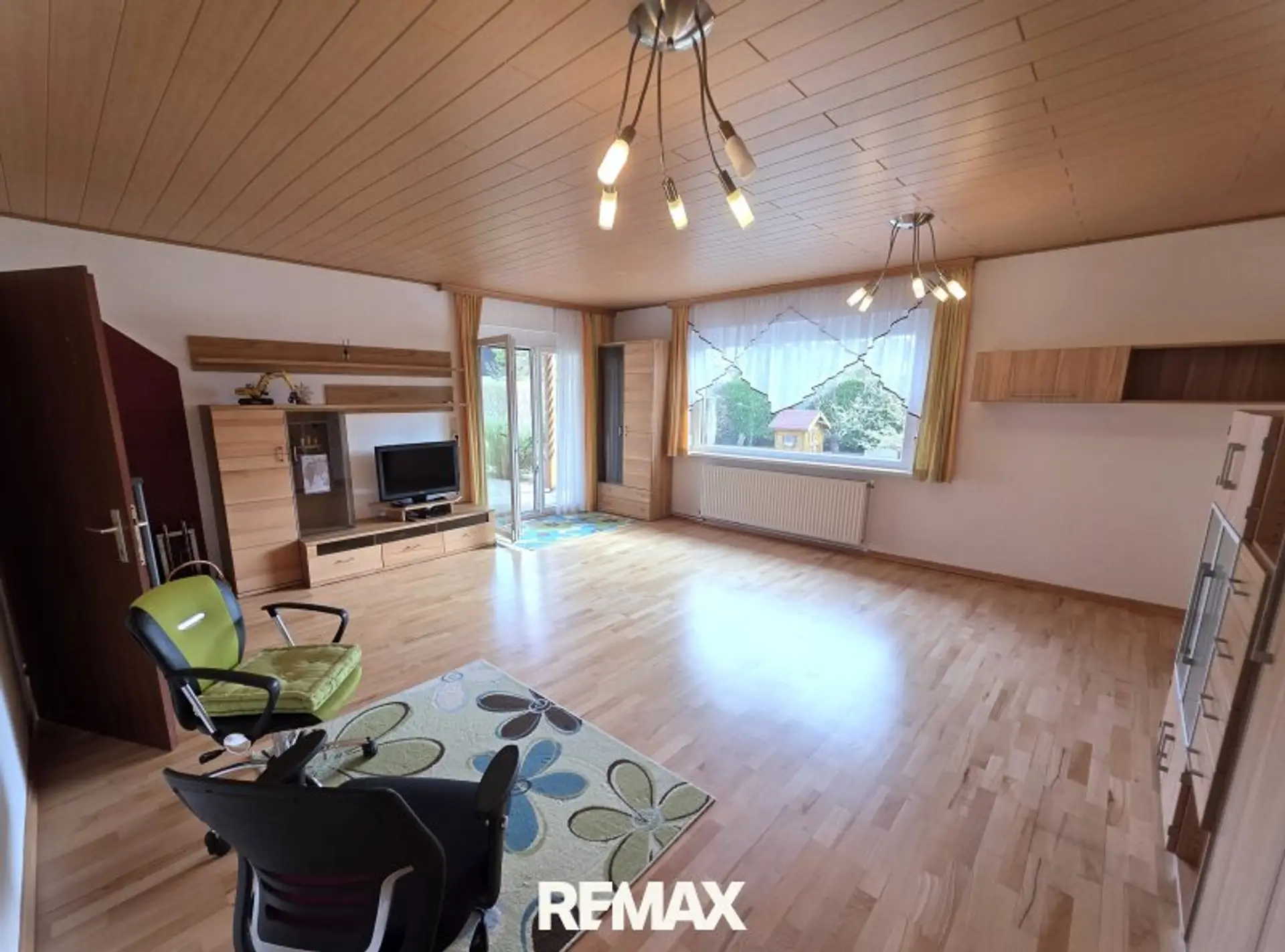 Das Herzstück ist das großzügige Wohnzimmer mit beeindruckender Fixverglasung zum Garten. Der direkte Zugang zur Terrasse verstärkt dieses Wohngefühl zusätzlich. Ein hochwertiger Buchenparkettboden sowie ein zusätzlicher Ofen sorgen für warme Atmosphäre – auch in der Übergangszeit.