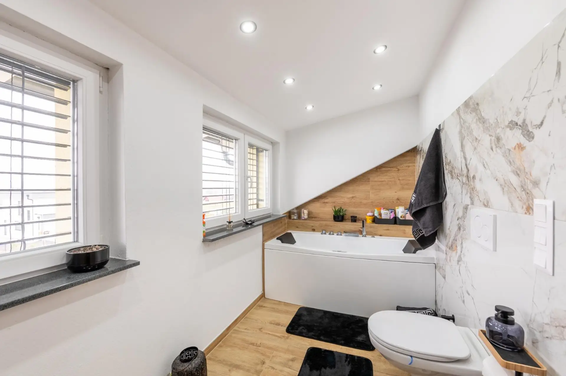 • Badezimmer mit Badewanne und WC mit Ausblick