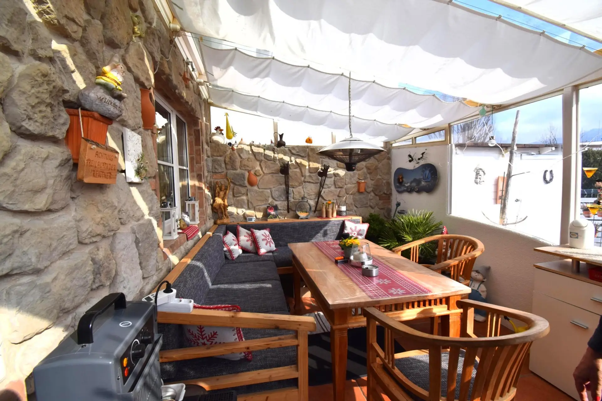 Ein besonderes Highlight ist die rund 100 m² große Terrasse mit schöner Aussicht – ein idealer Rückzugsort für entspannte Stunden im Freien, gesellige Abende oder sonnige Tage mit Blick ins Grüne.