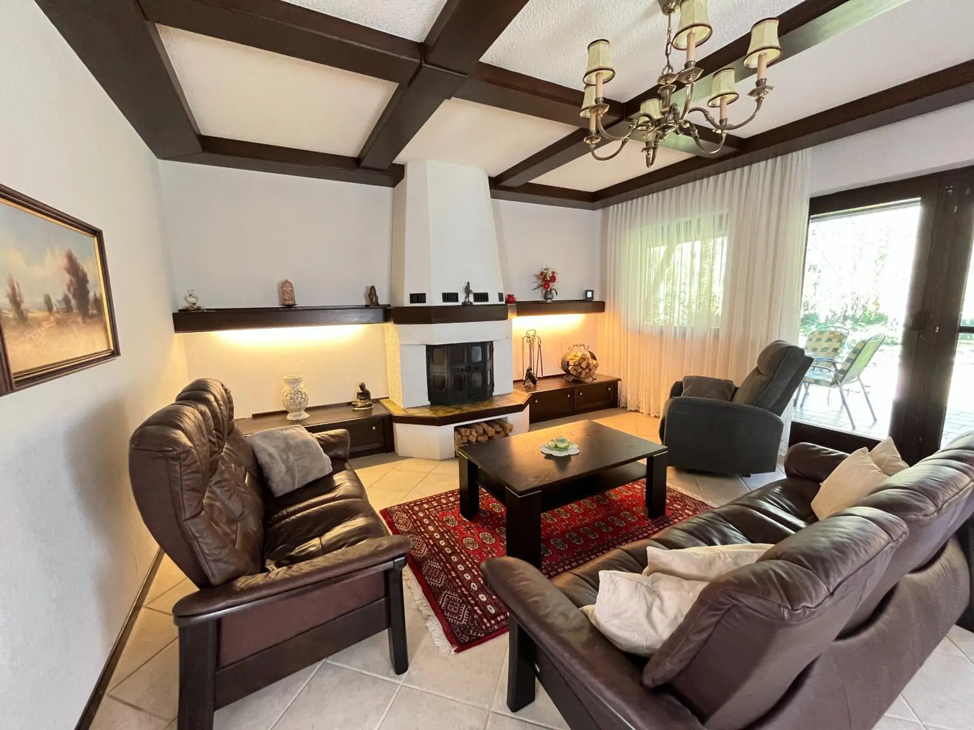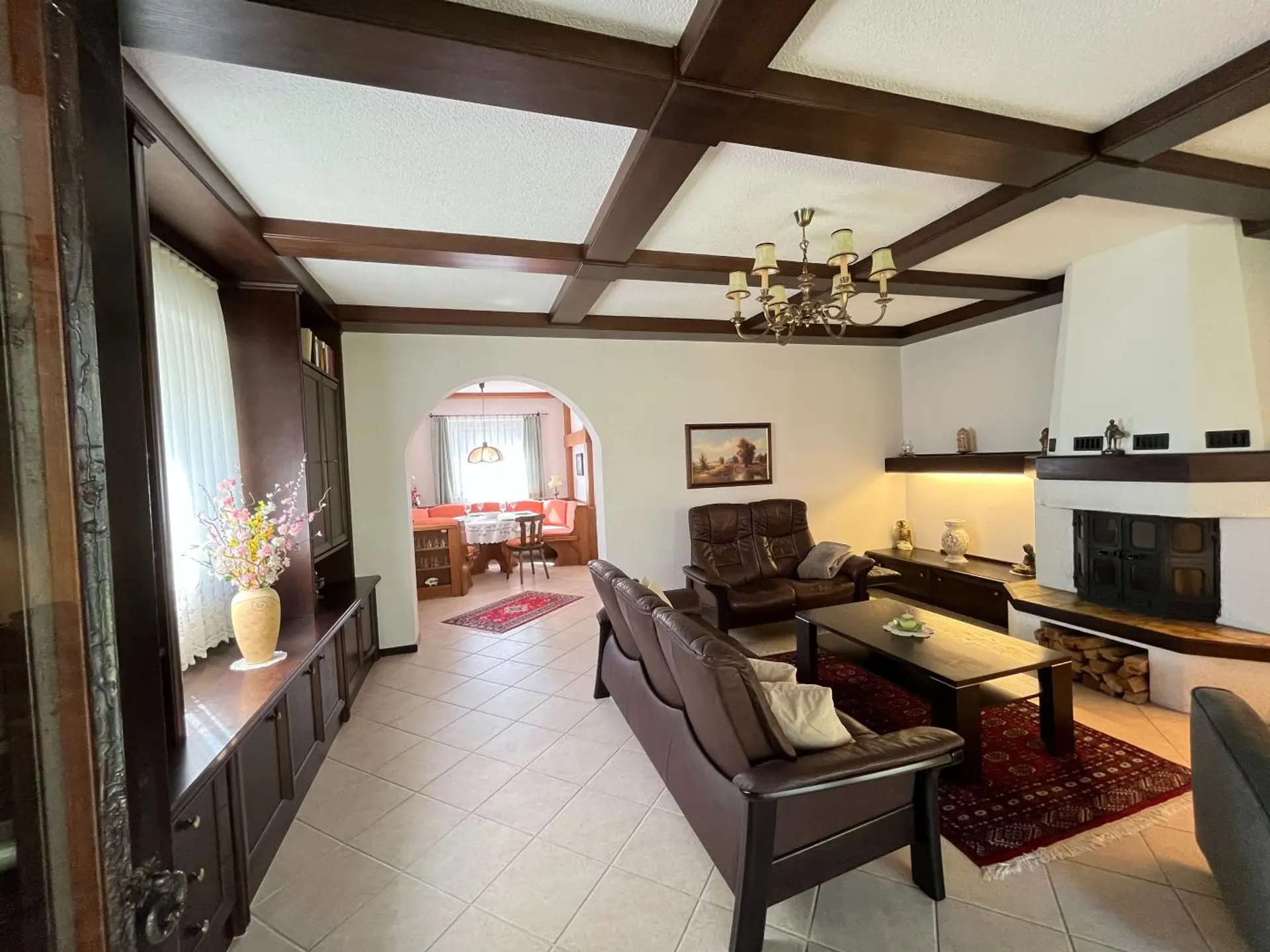 o Wohnzimmer mit Kamin, der behagliche Wärme spendet, und Zugang zur Terrasse (Loggia)