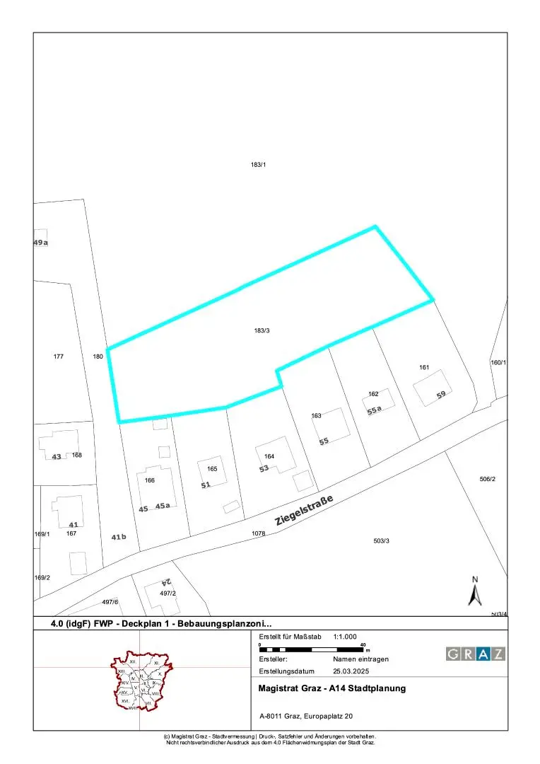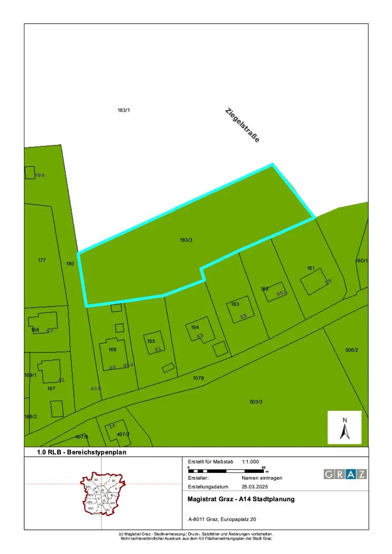Laut Flächenwidmungsplan 4.0 der Stadt Graz und dem Stadtentwicklungskonzept liegt das Grundstück im Grüngürtel, lt. FLÄWI 4.0 ist kein Bebauungsplan erforderlich.