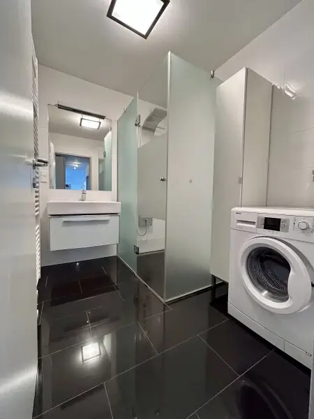 Badezimmer mit Dusche und Waschmaschinenanschluss