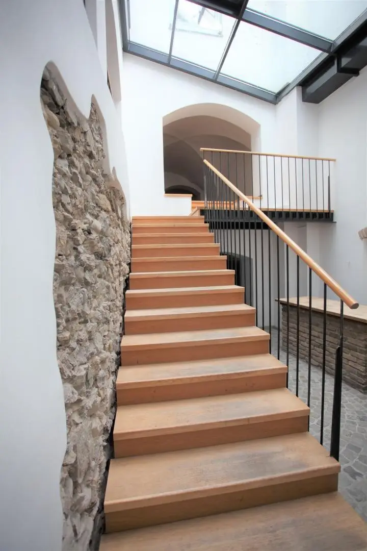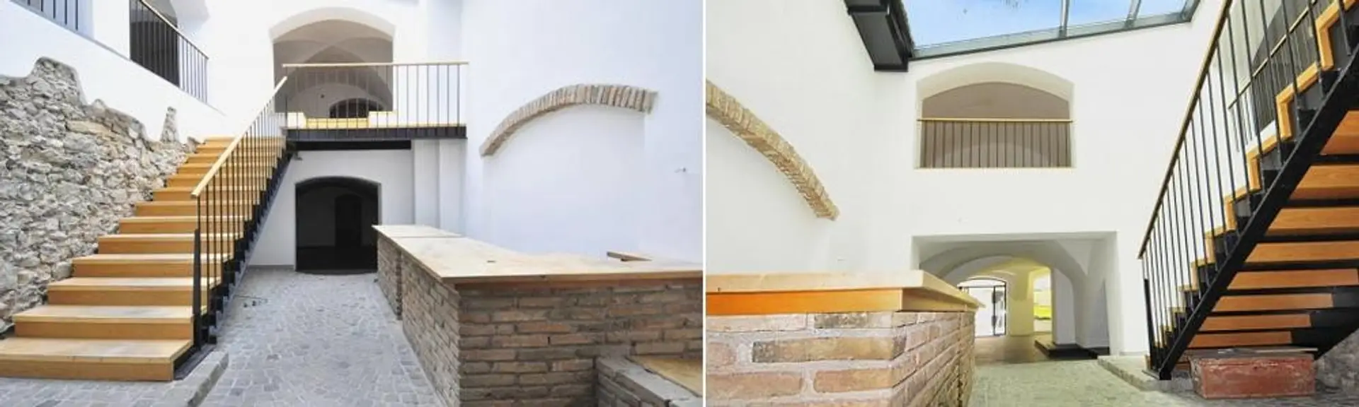 restaurierte Holzfußböden, neue Sanitäranlagen, neue Fußbodenheizung, verglaster Atriumhof
