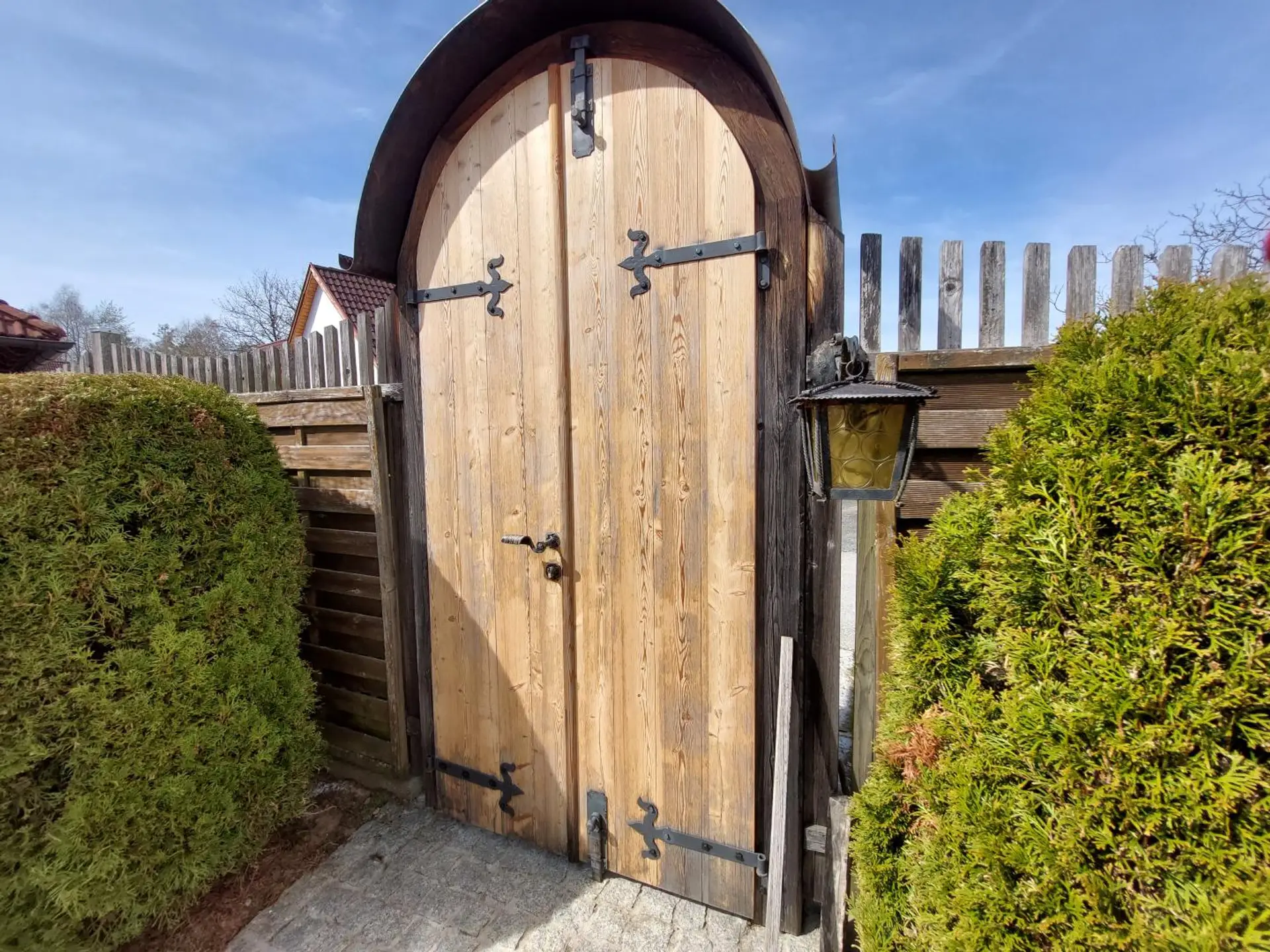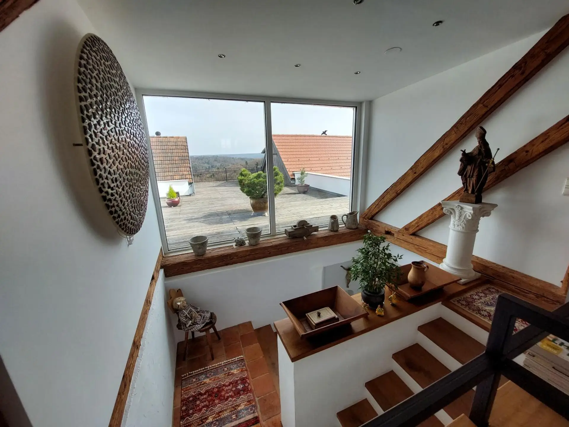 Der Außenraum ist kein Garten im klassischen Sinn, sondern eine komponierte Landschaft aus Stimmungen und Perspektiven. Unterschiedlich gestaltete Sitzplätze laden dazu ein, den Tag immer wieder neu zu inszenieren. Eine teilweise überdachte Terrasse öffnet den Blick in die Ferne und wird in den Sommermonaten selbst zur Bühne des Lebens – ein Ort für stille Morgenstunden ebenso wie für lange Abende unter freiem Himmel, gesellige Stunden oder Momente des Innehaltens.