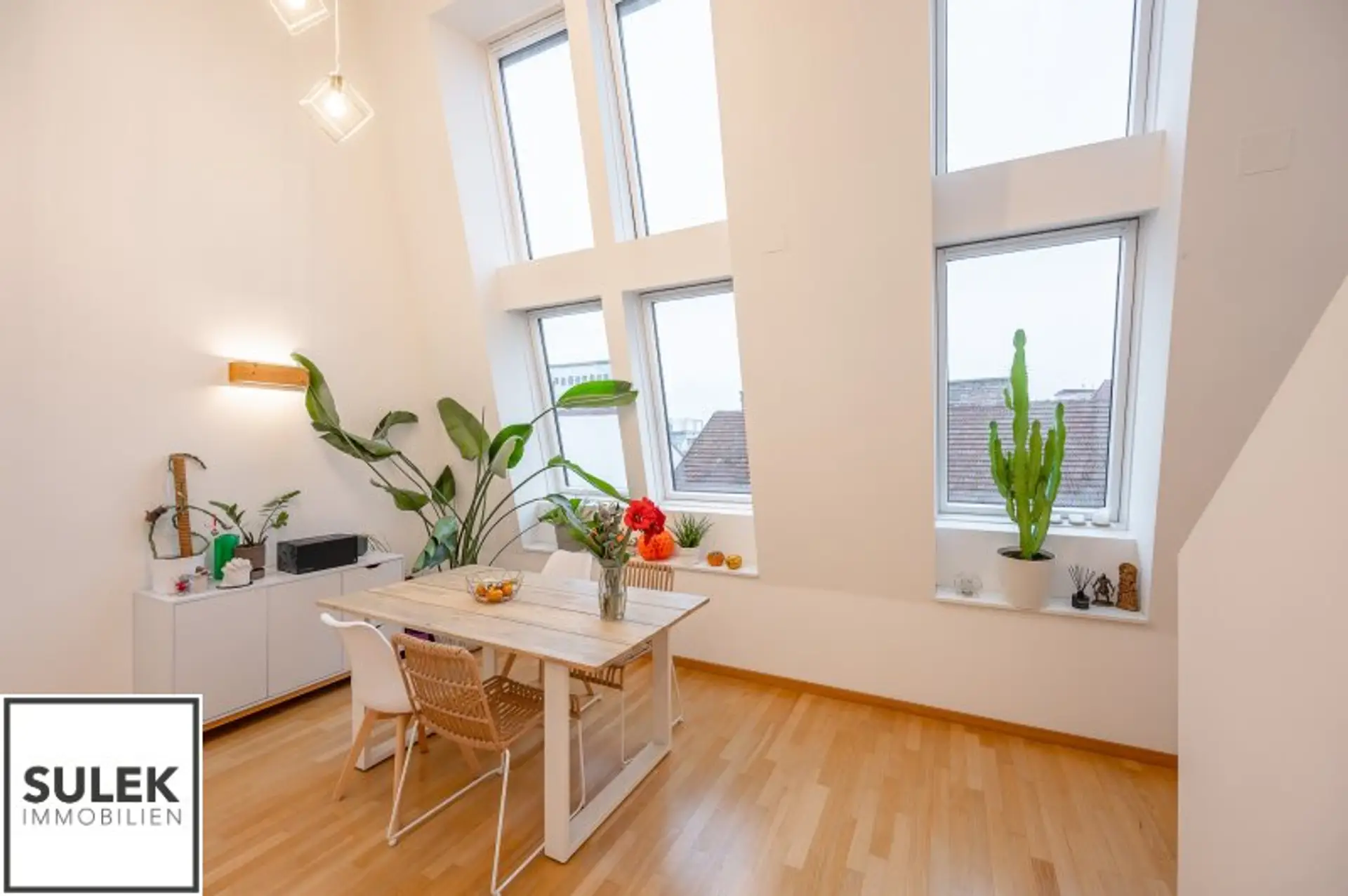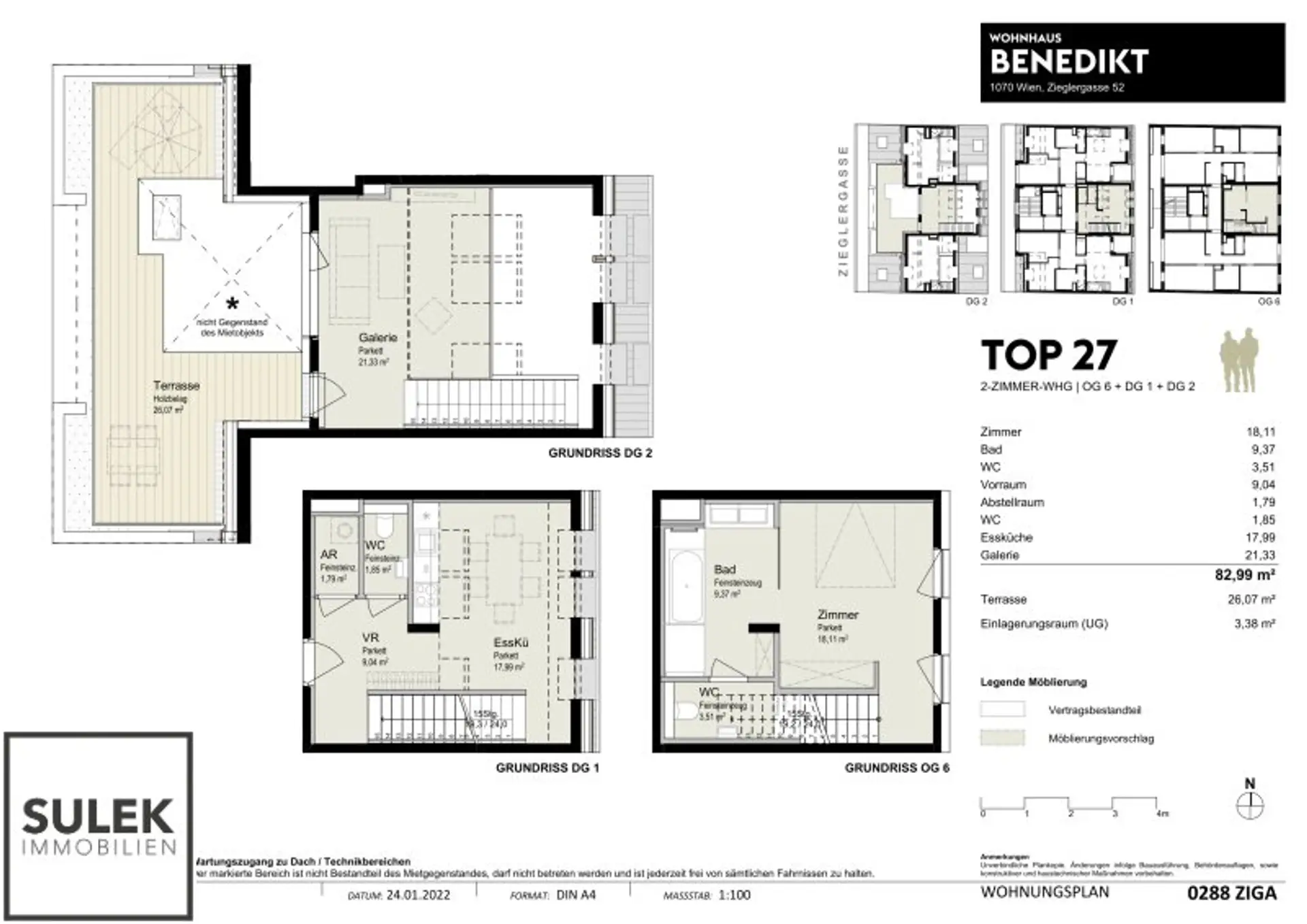Das Mietwohnung erstreckt sich über 3 Ebenden (im 6. Liftobergeschoss sowie 1.DG & 2.DG) und umfasst eine Wohnfläche von ca. 83 m², die sich wie folgt aufteilt: