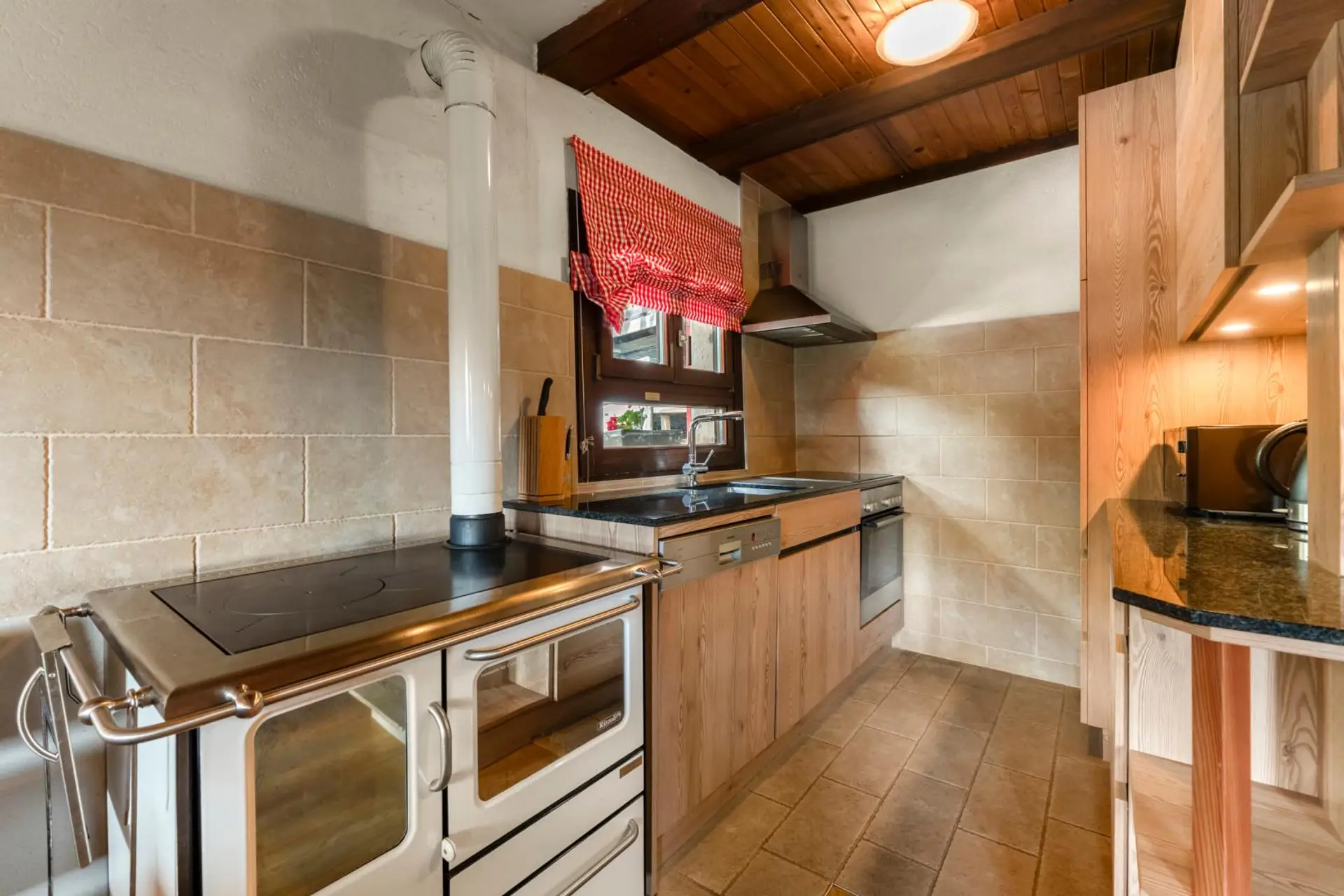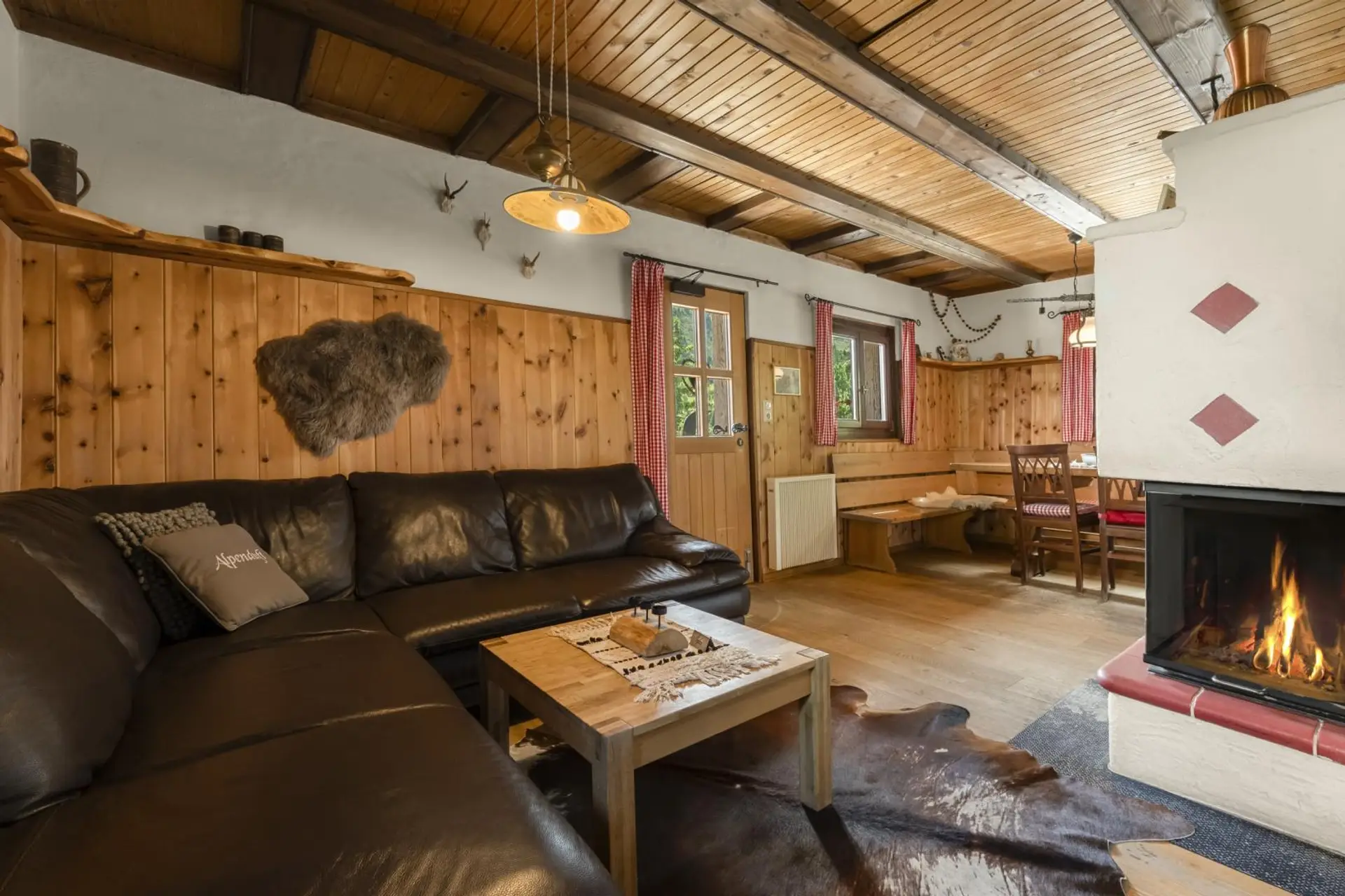 Im Erdgeschoss befindet sich ein Windfang samt Garderobe, ein Abstellraum sowie ein Badezimmer mit Dusche und WC. Weiters empfängt Sie ein offener, gemütlicher Koch-/Wohn-/Essbereich, der mit einem Kaminofen ausgestattet ist, der für wohlige Wärme sorgt und eine gemütliche Atmosphäre schafft. Vom Wohnbereich aus haben Sie direkten Zugang zur großzügigen, ca. 36 m² großen Terrasse – ein Ort, der zum Verweilen und Genießen einlädt. Dort befindet sich ein „Hot Pot“ (ein Badevergnügen im Holzfass), von dem aus sich ein herrlicher Blick auf den Falkertspitz eröffnet.