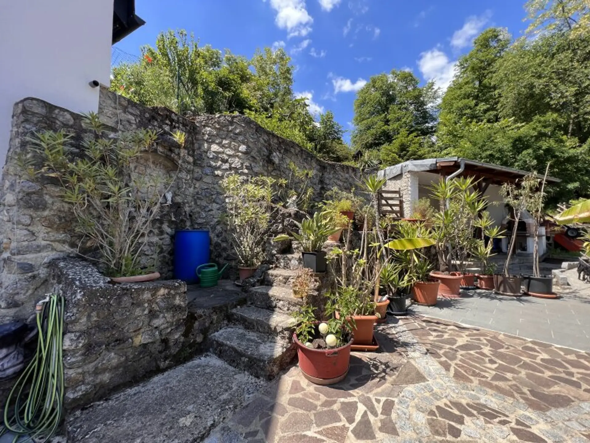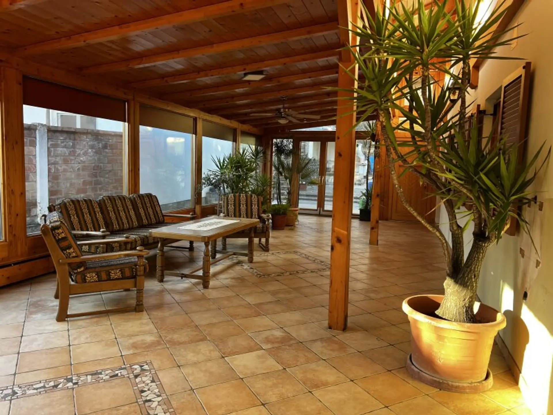Das absolute Herzstück dieser Liegenschaft ist der großzügige Wintergarten mit rund 56 m², der das Wohnen mitten im Grün ermöglicht – umgeben von mediterranen Pflanzen und der charmanten Steinmauer.