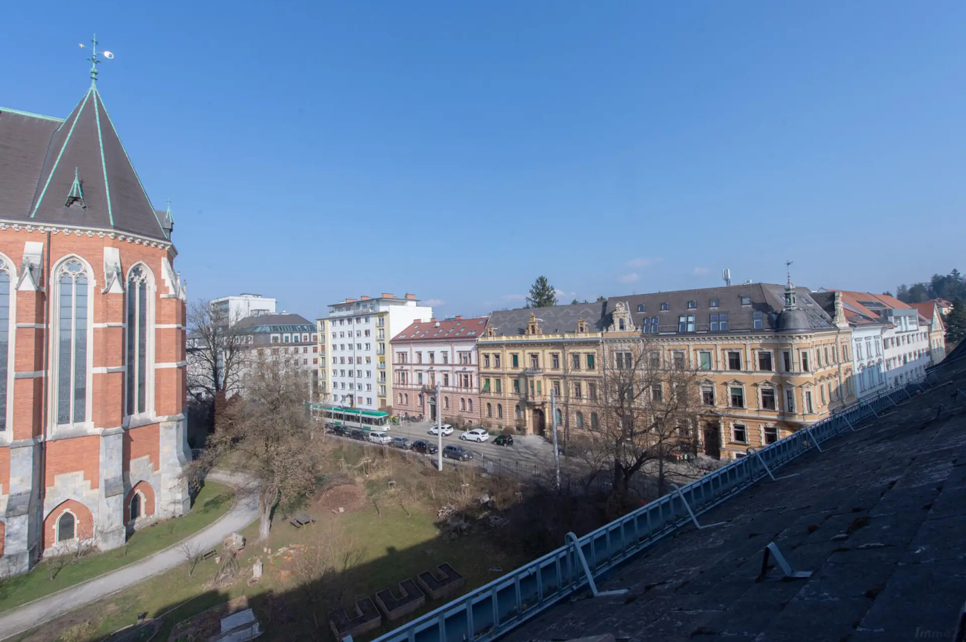 - Hofseitiger Balkon mit Blick auf den weitläufigen Innenhof und die Herz-Jesu-Kirche – Ruhe mitten in der Stadt