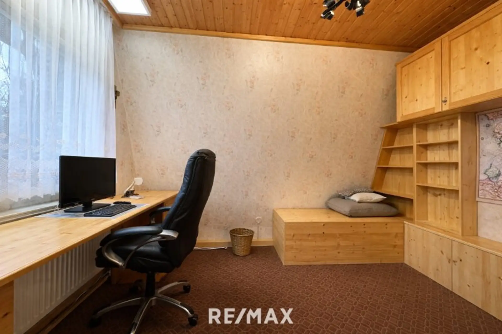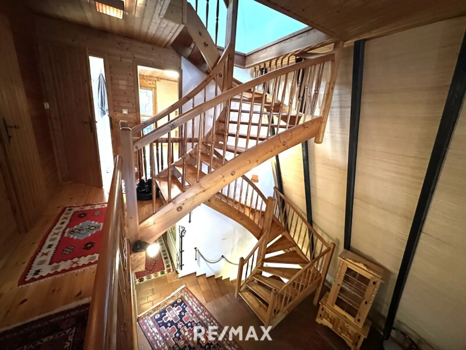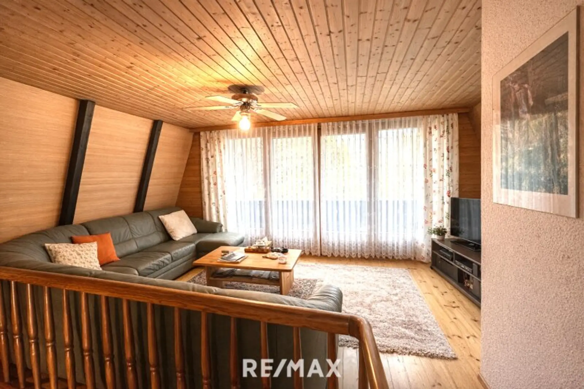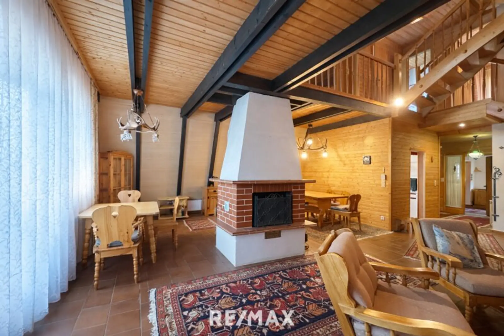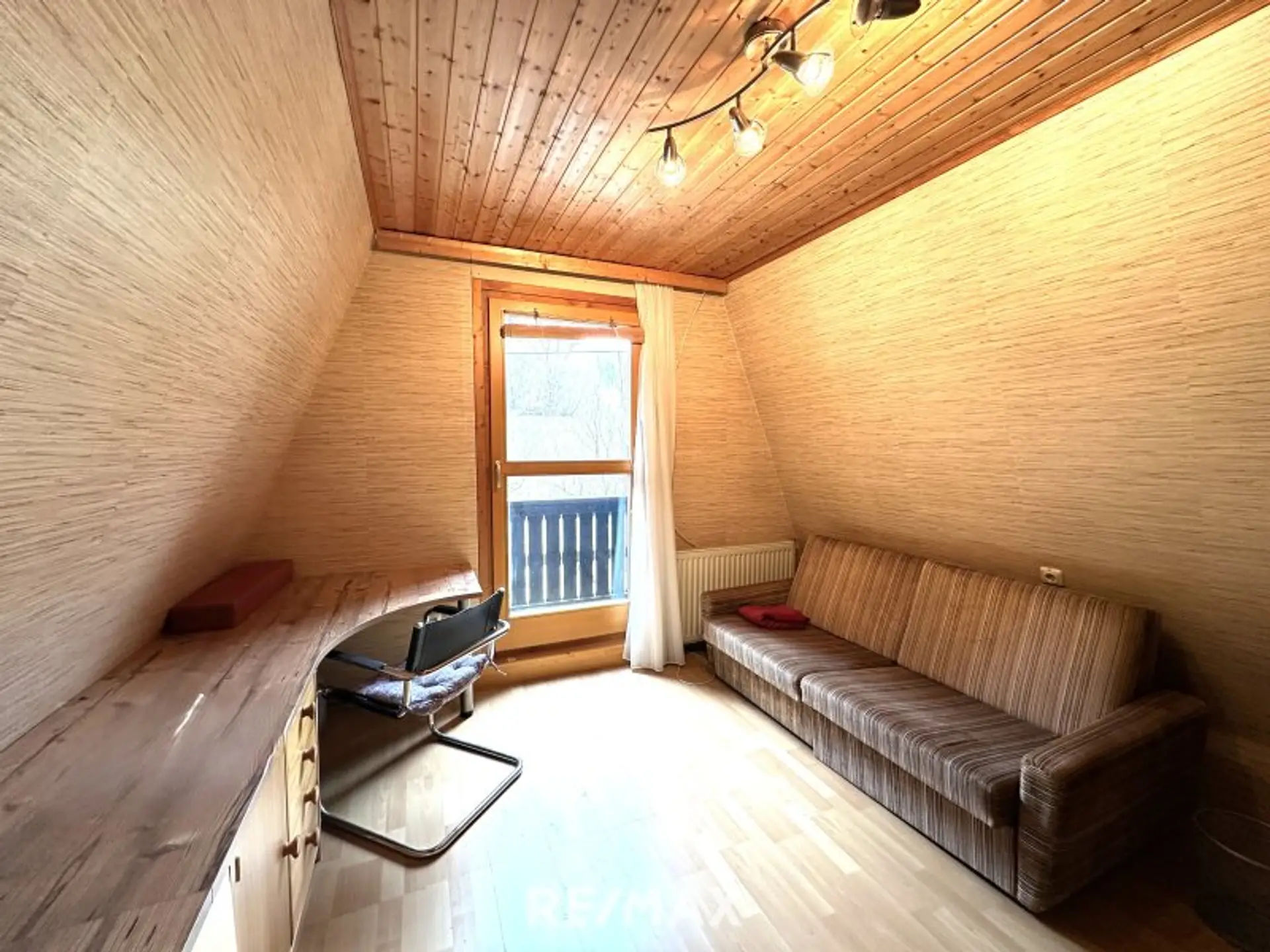Die durchgehende Holzverkleidung im Innenbereich unterstreicht den naturnahen Charakter und schafft eine warme, einladende Wohnatmosphäre.