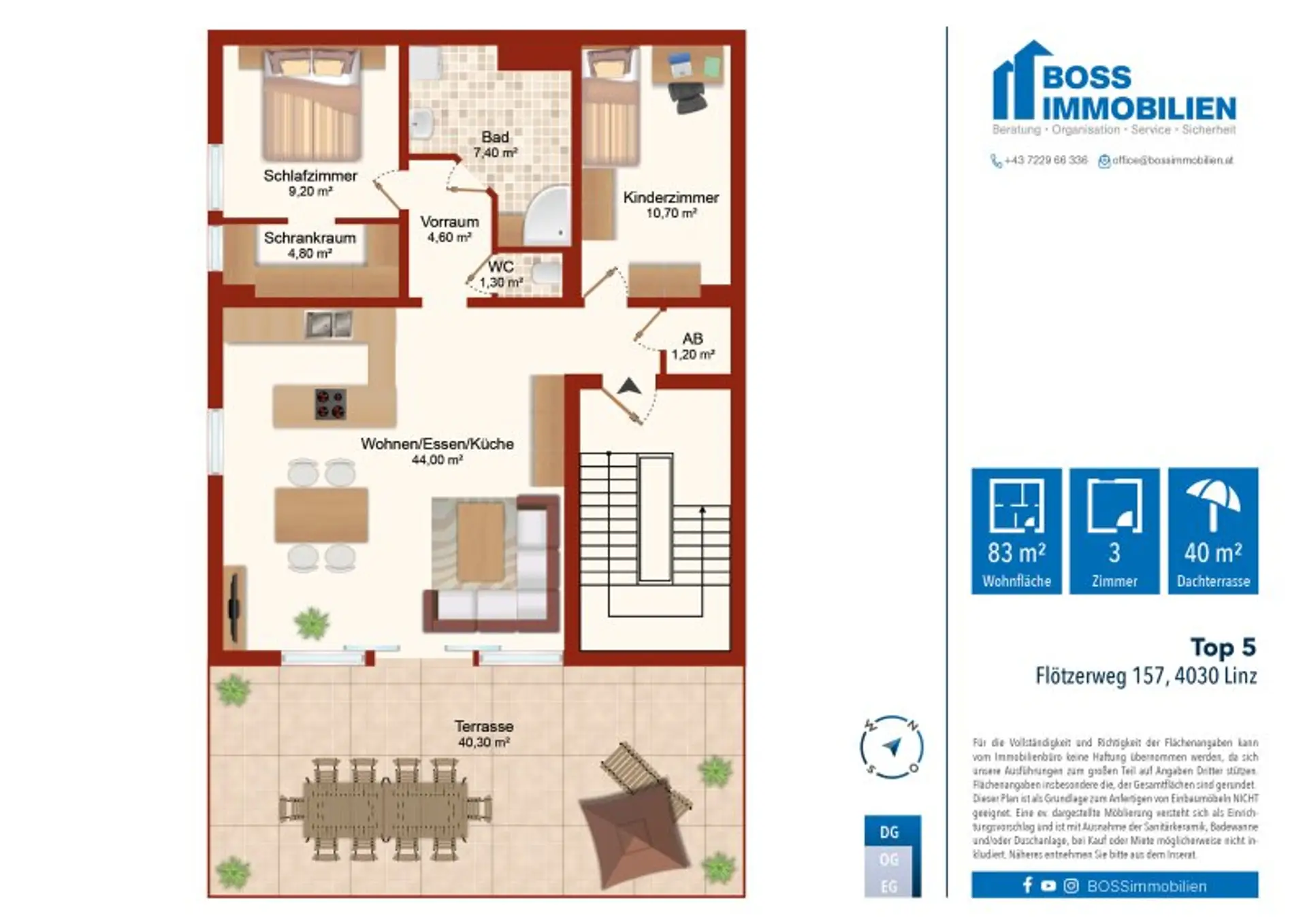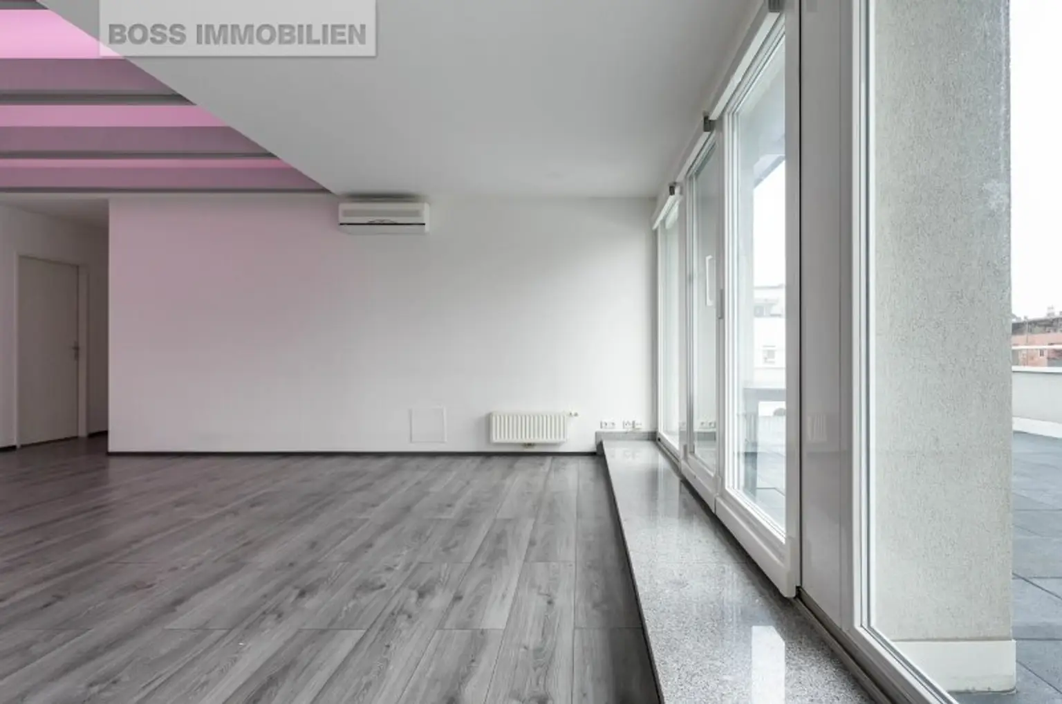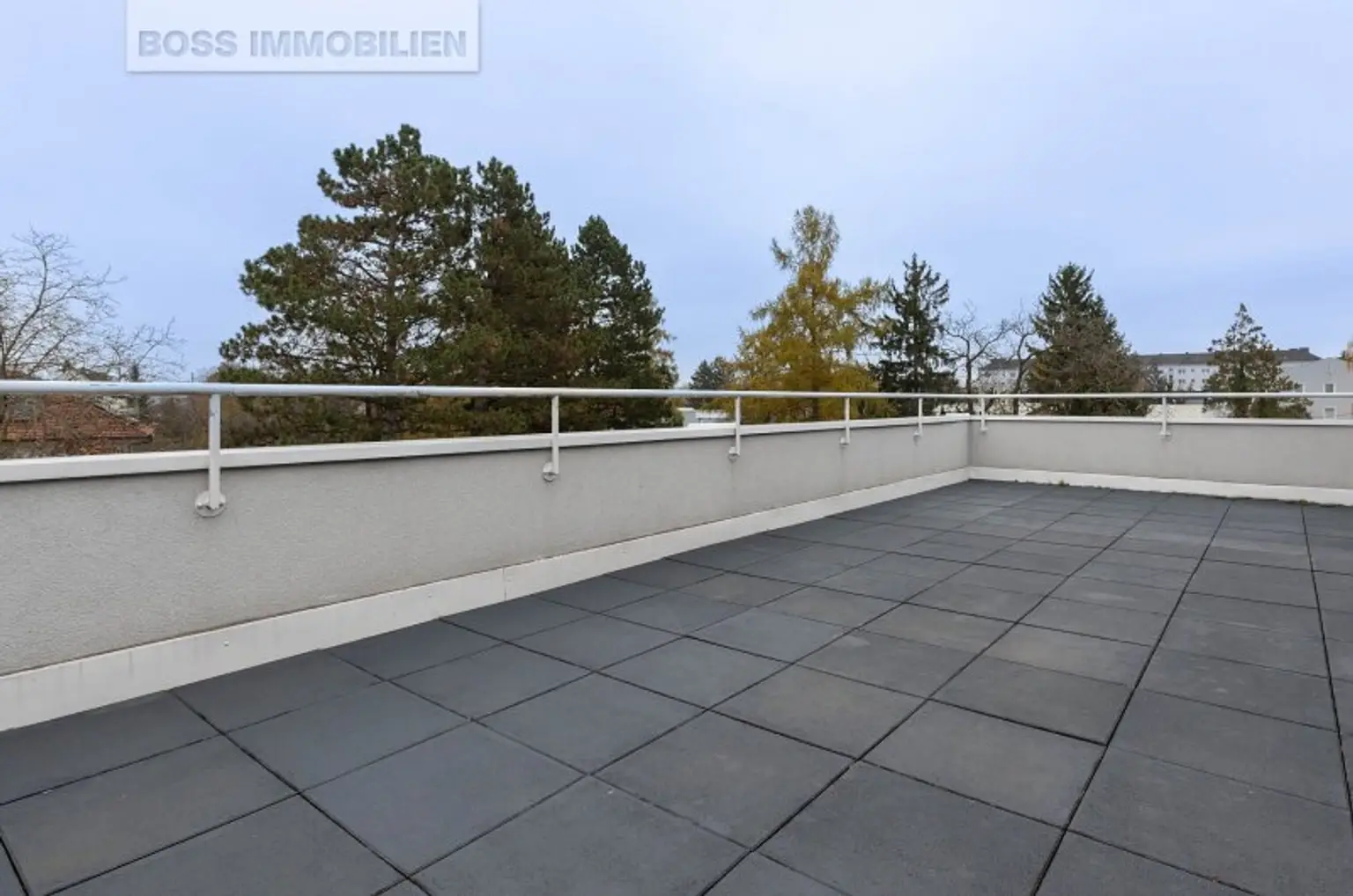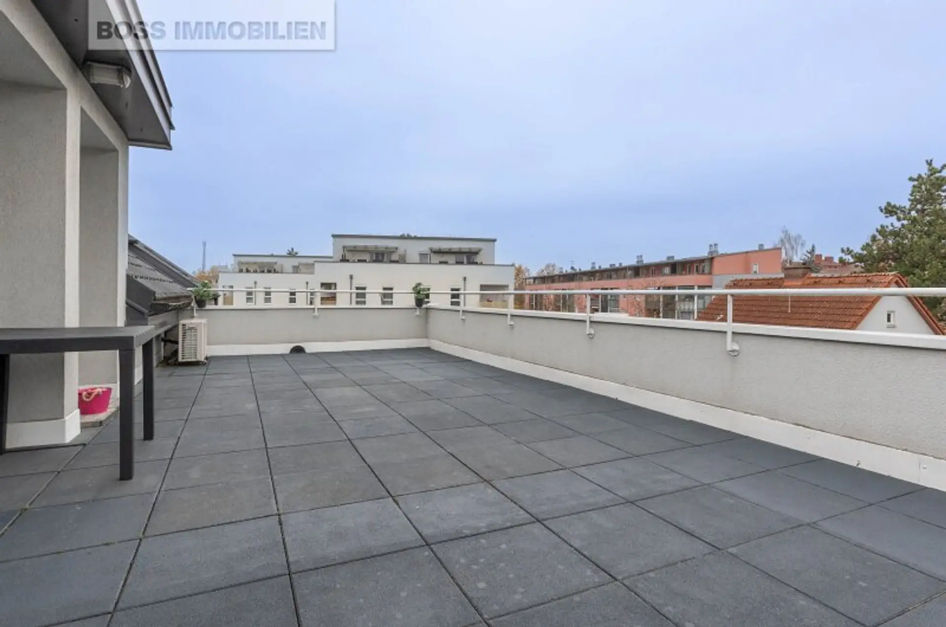 Das Herzstück dieser Wohnung ist die rund 40 m² große, östlich ausgerichtete Terrasse, die Ihren Wohnraum ins Freie erweitert. Ob beim entspannten Sonnenbaden tagsüber oder beim Ausklingen des Abends mit einem Glas Wein – hier genießen Sie einen herrlichen Ausblick in die Umgebung.