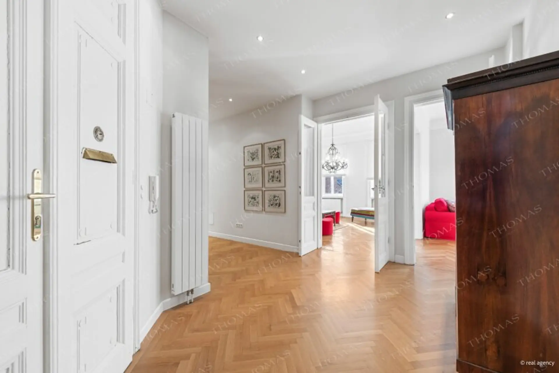 Stilvolle Altbauelemente wie Flügeltüren und Parkettböden