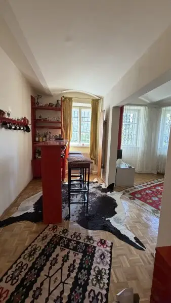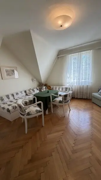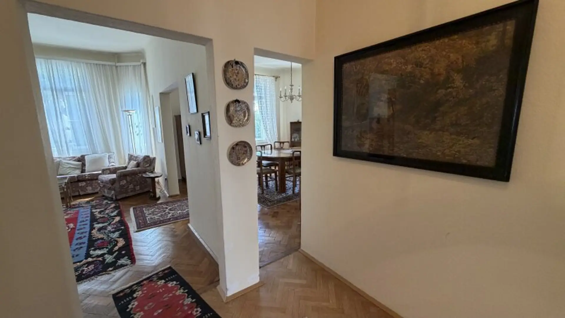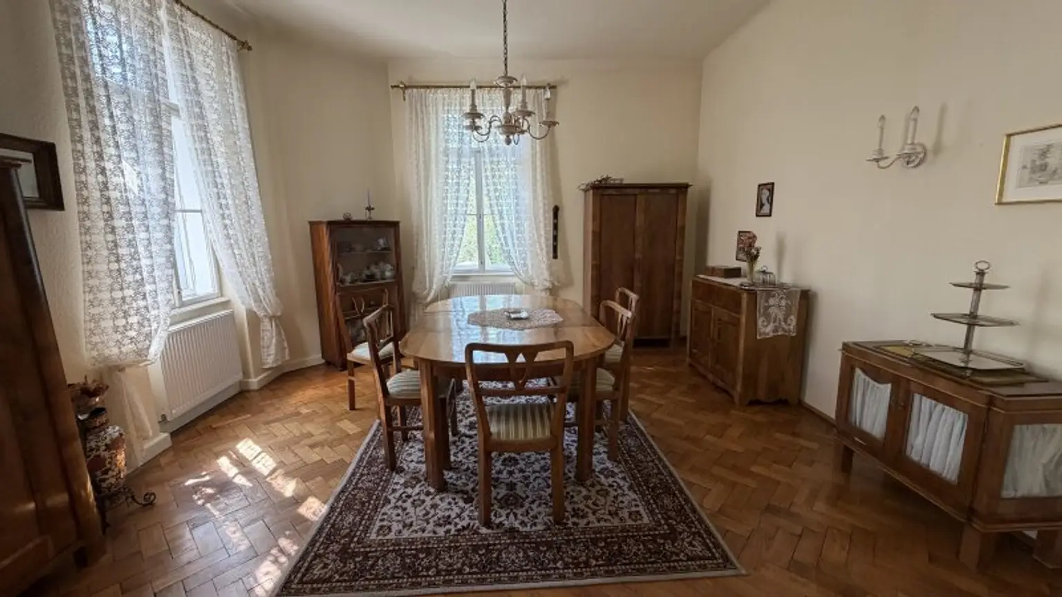 Hochparterre und Dachgeschoss wurden zuletzt als großzügige Einheit genutzt und umfassen mehrere Zimmer sowie Küche, Badezimmer und WC. Darüber erschließt sich ein weiterer Dachbereich mit Mansardenzimmer, sanitären Anschlüssen und Zugang zum Rohdachboden.