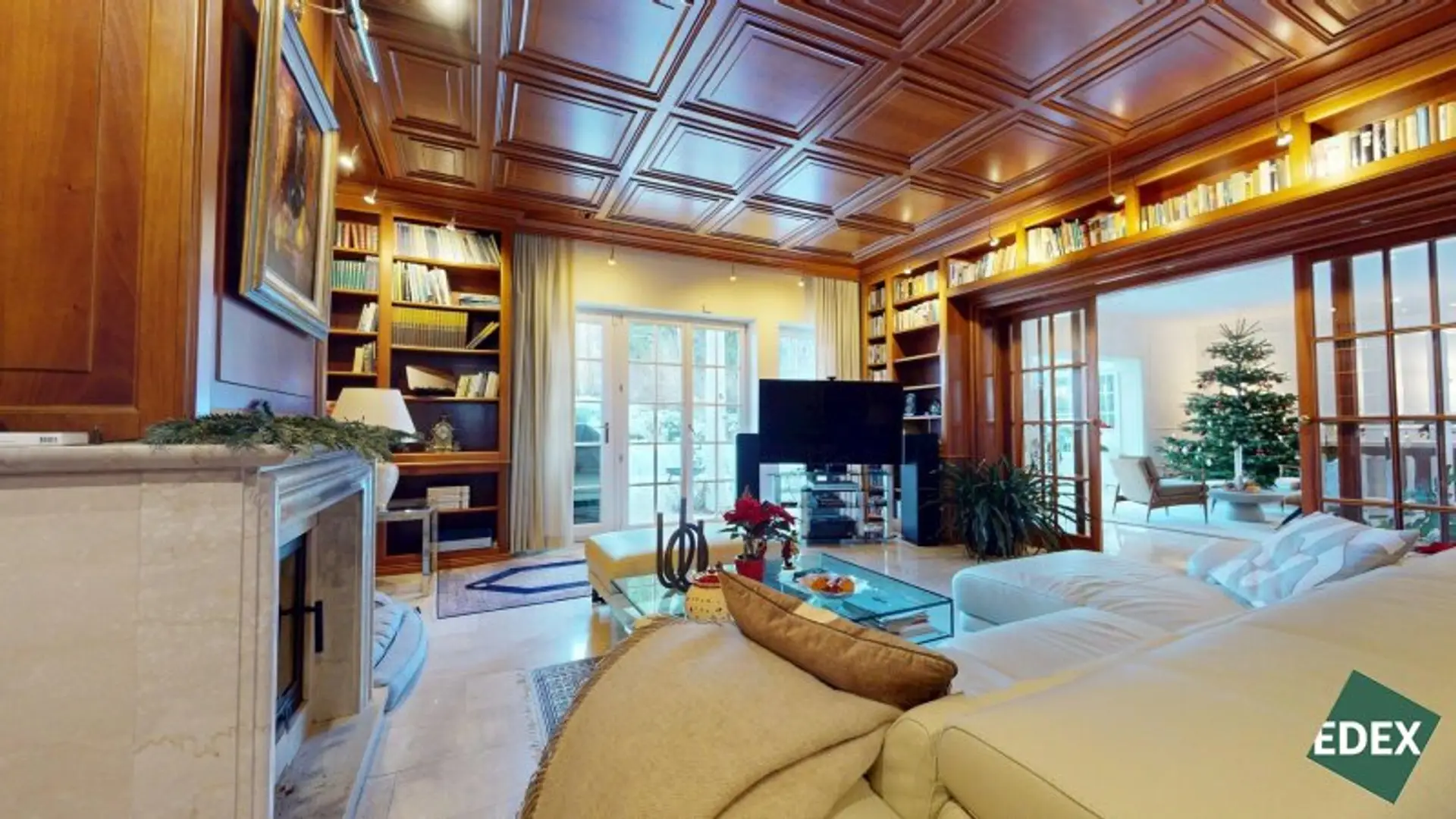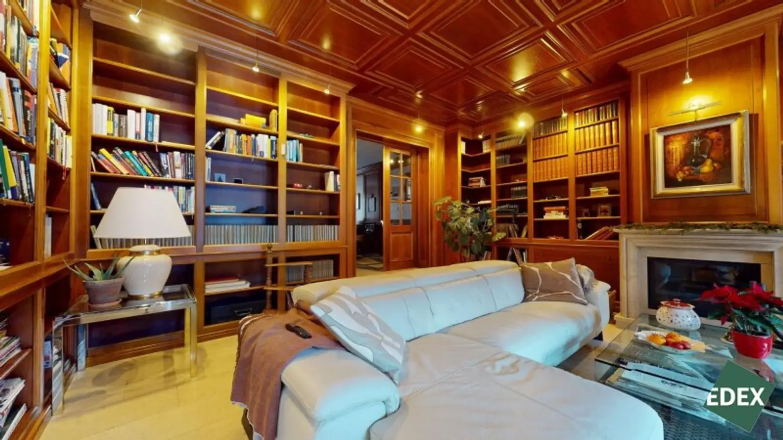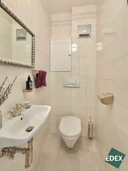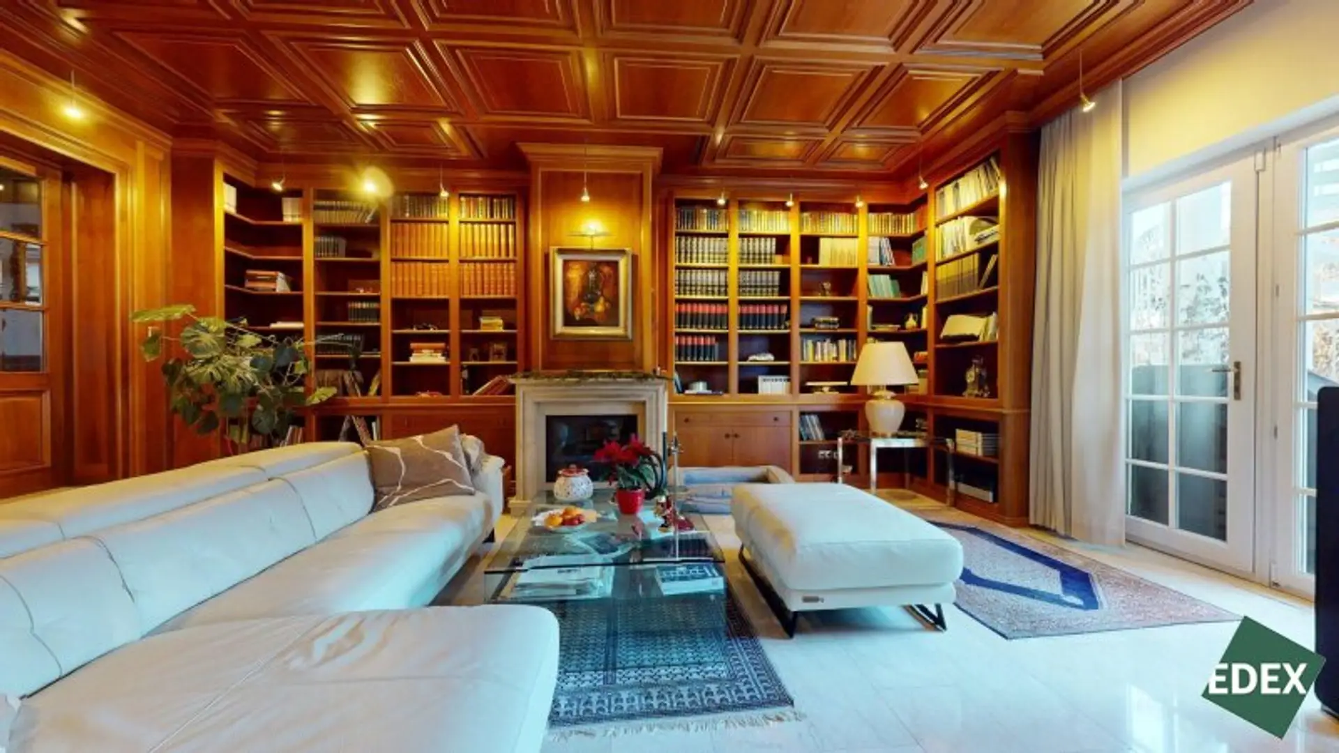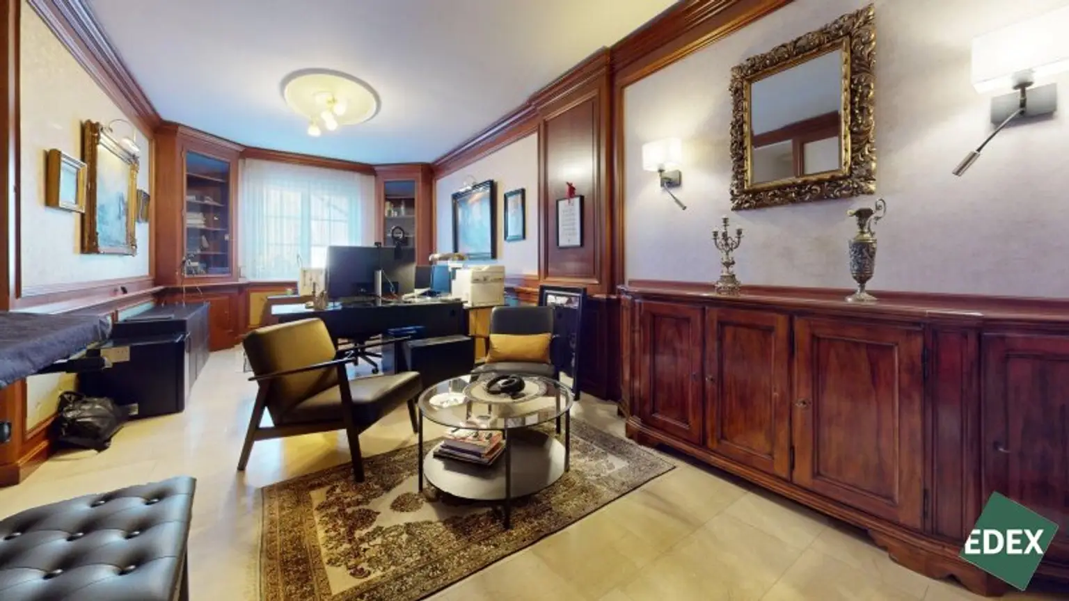Angrenzend an den Wohnsalon befindet sich eine stilvolle Bibliothek mit exquisiter Holztäfelung und offenem Kamin – ein Raum für Ruhe, Inspiration oder repräsentatives Arbeiten.Ein weiteres Arbeitszimmer, das auch als Schlafzimmer genutzt werden kann, bietet flexible Wohnmöglichkeiten. Von hier führt ein Verbindungsgang zu einem separaten WC sowie einem Badezimmer mit Badewanne, Dusche und Bidet.