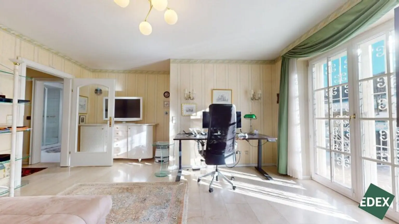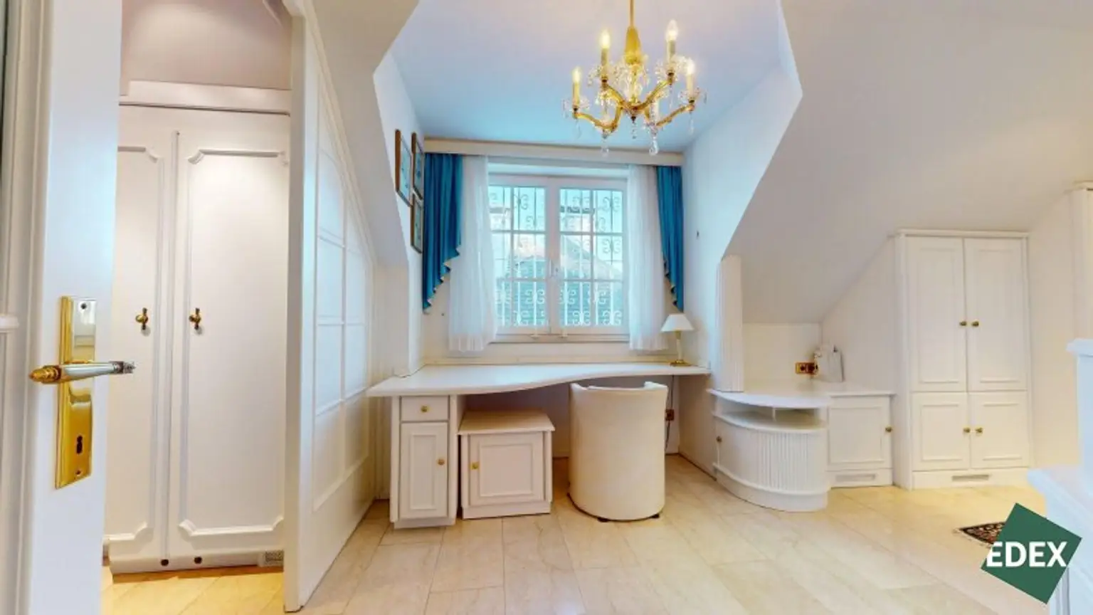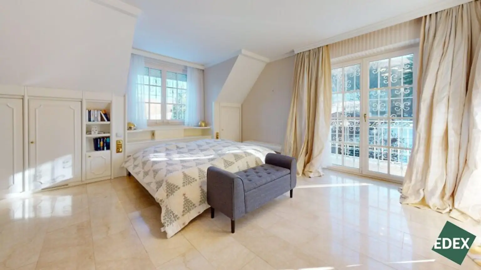 Angrenzend an den Wohnsalon befindet sich eine stilvolle Bibliothek mit exquisiter Holztäfelung und offenem Kamin – ein Raum für Ruhe, Inspiration oder repräsentatives Arbeiten.Ein weiteres Arbeitszimmer, das auch als Schlafzimmer genutzt werden kann, bietet flexible Wohnmöglichkeiten. Von hier führt ein Verbindungsgang zu einem separaten WC sowie einem Badezimmer mit Badewanne, Dusche und Bidet.