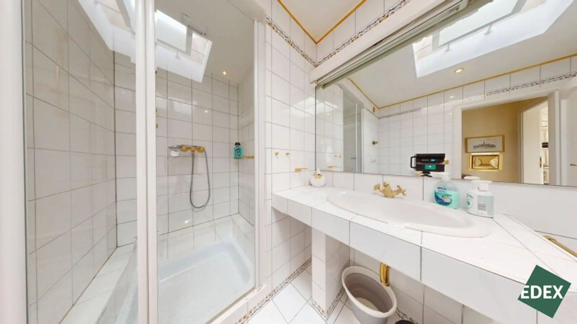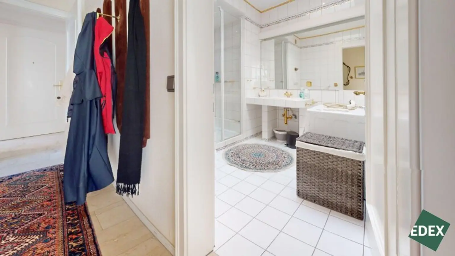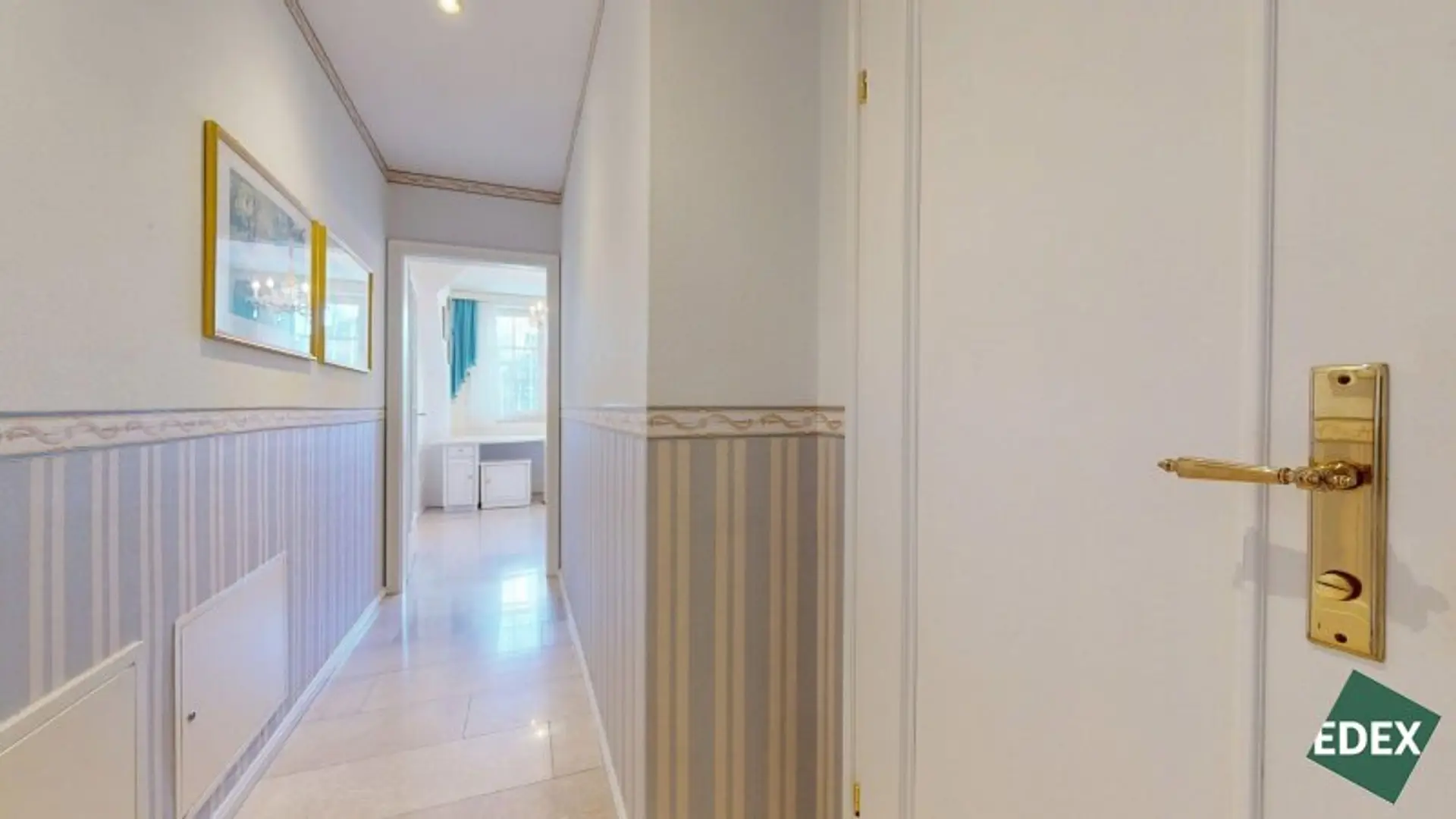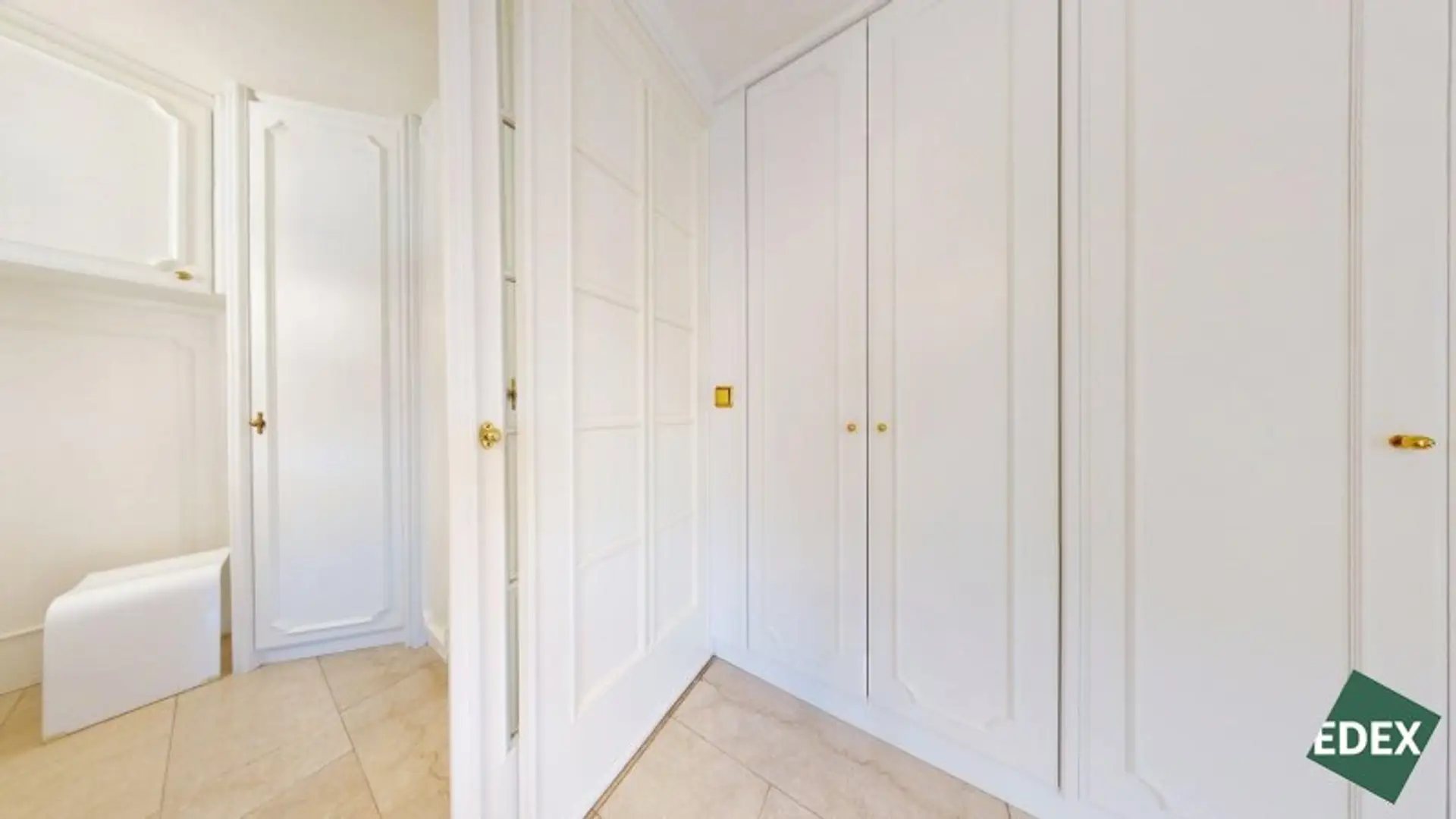 Angrenzend an den Wohnsalon befindet sich eine stilvolle Bibliothek mit exquisiter Holztäfelung und offenem Kamin – ein Raum für Ruhe, Inspiration oder repräsentatives Arbeiten.Ein weiteres Arbeitszimmer, das auch als Schlafzimmer genutzt werden kann, bietet flexible Wohnmöglichkeiten. Von hier führt ein Verbindungsgang zu einem separaten WC sowie einem Badezimmer mit Badewanne, Dusche und Bidet.