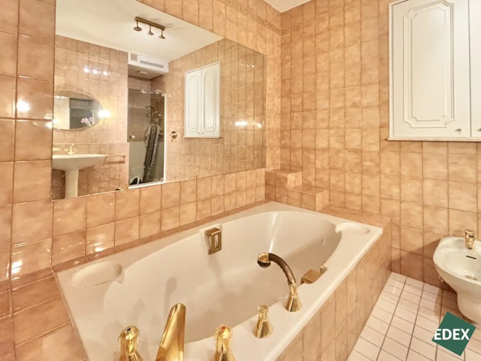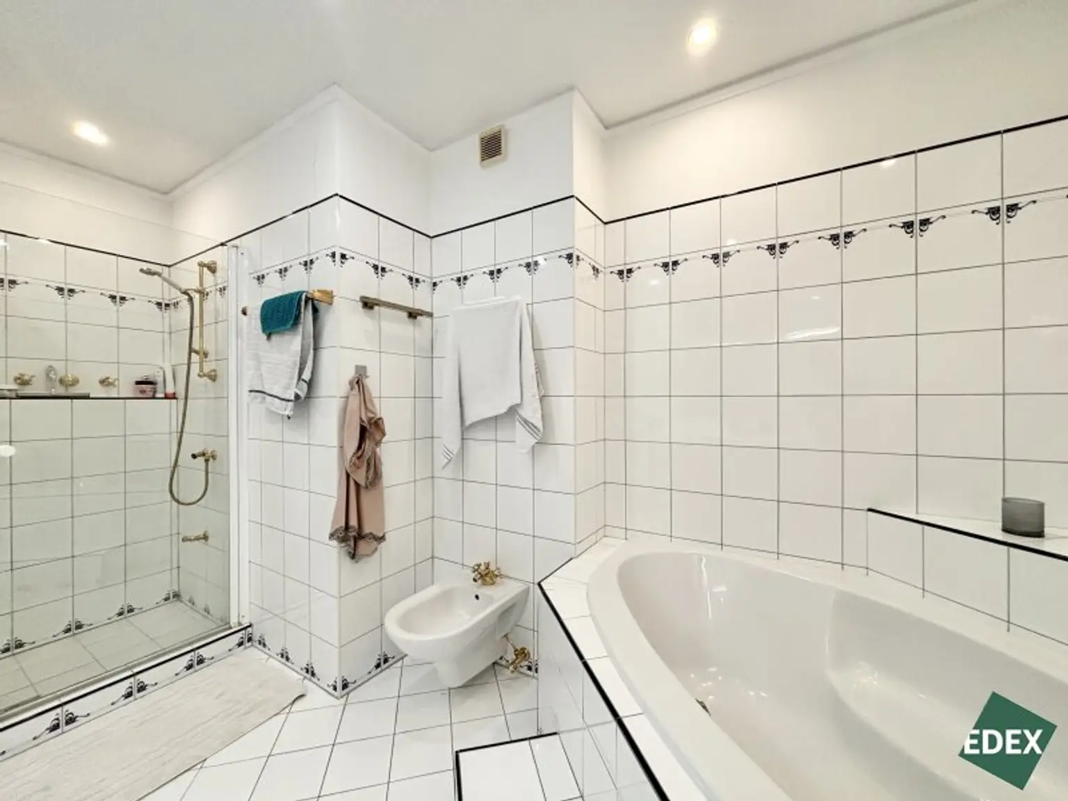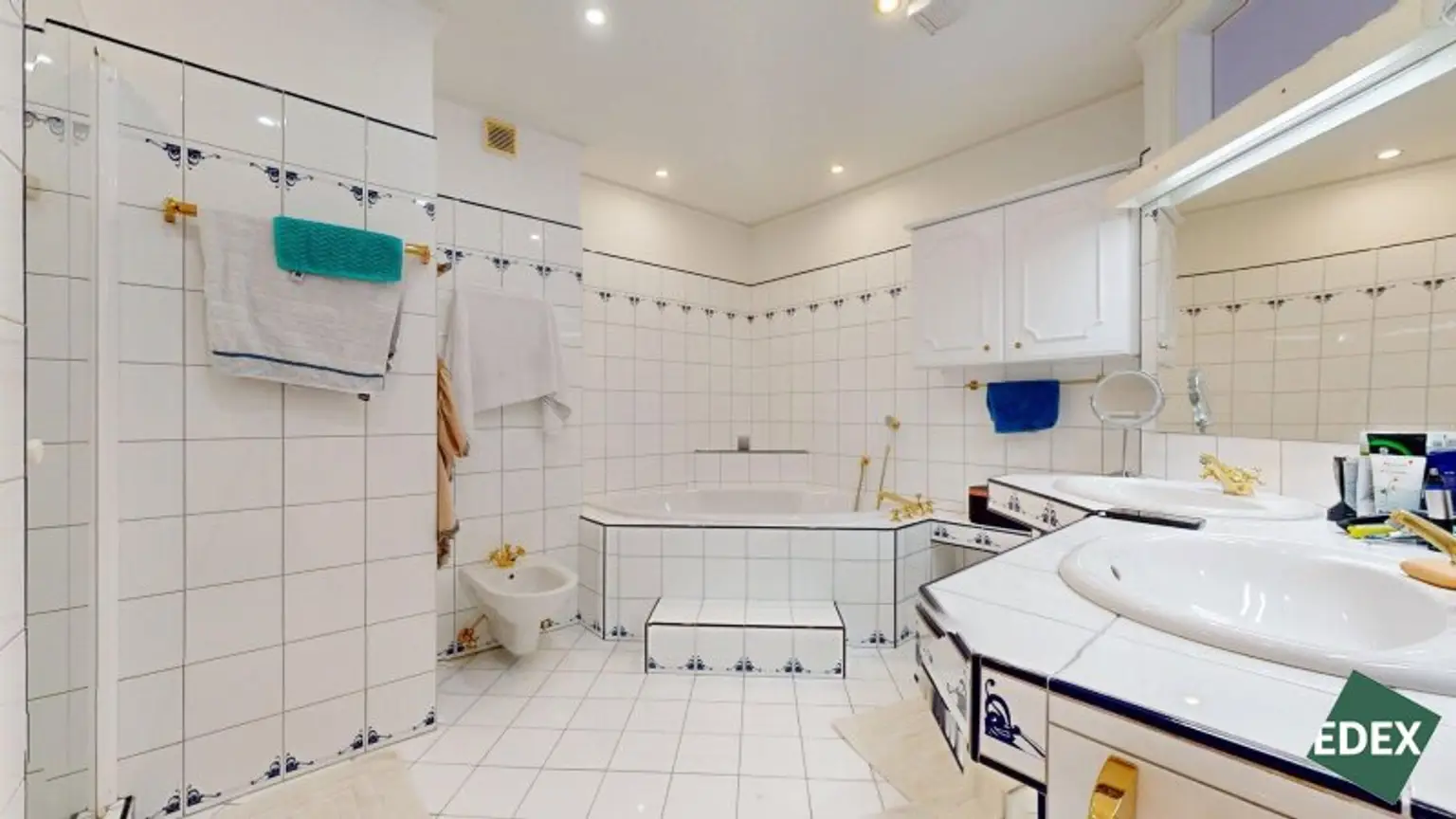 ein luxuriöses Badezimmer mit Eckbadewanne, Dusche, Doppelwaschbecken und Bidet