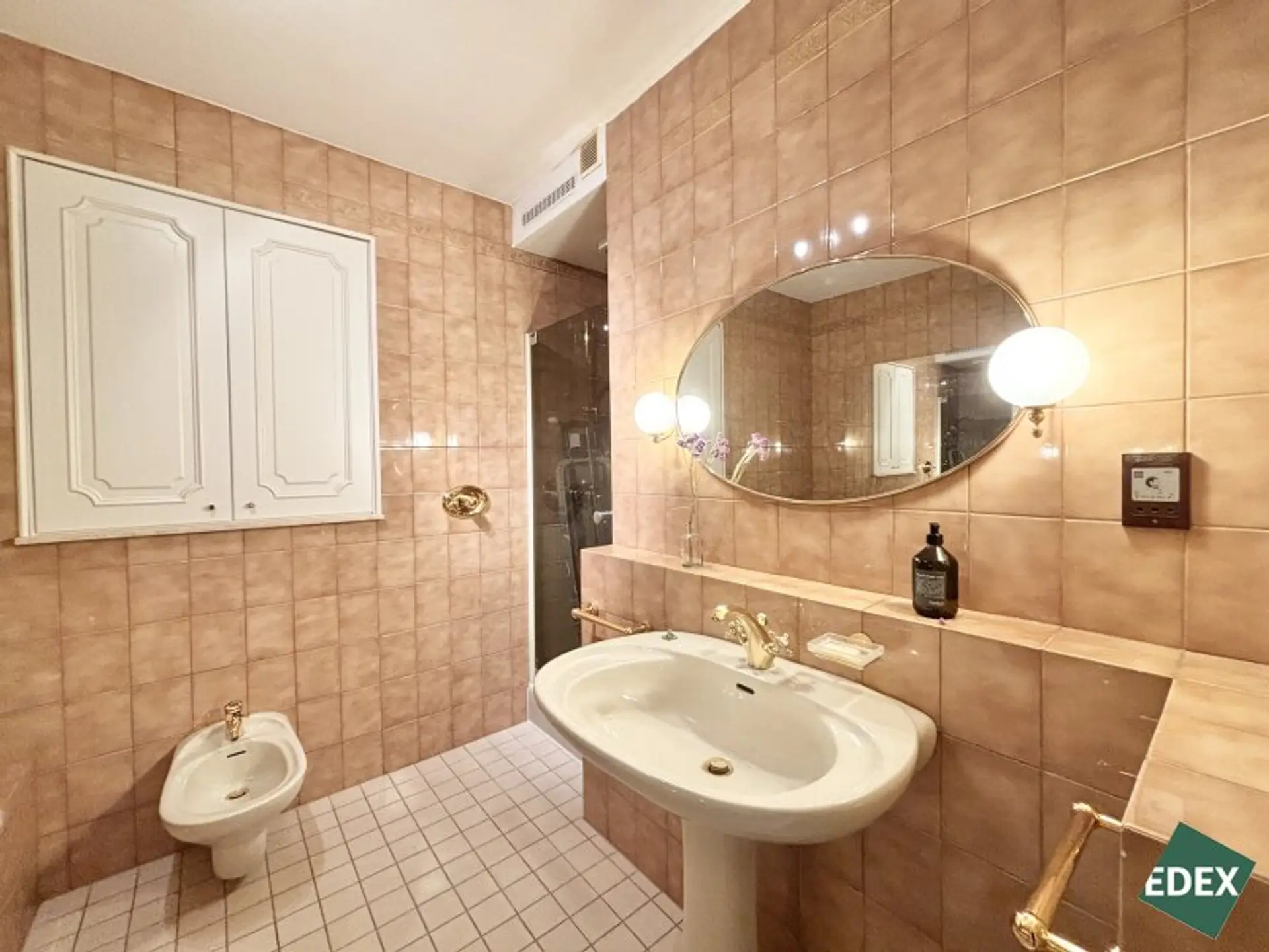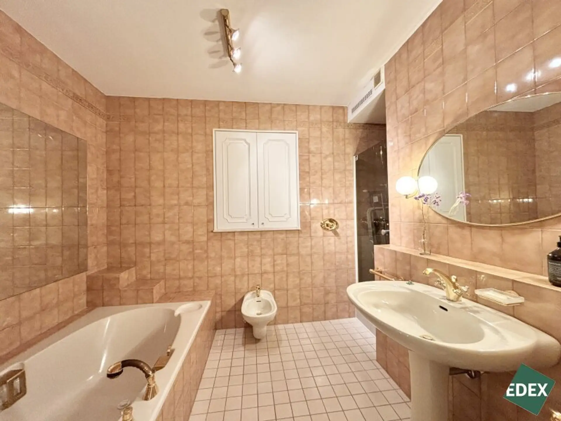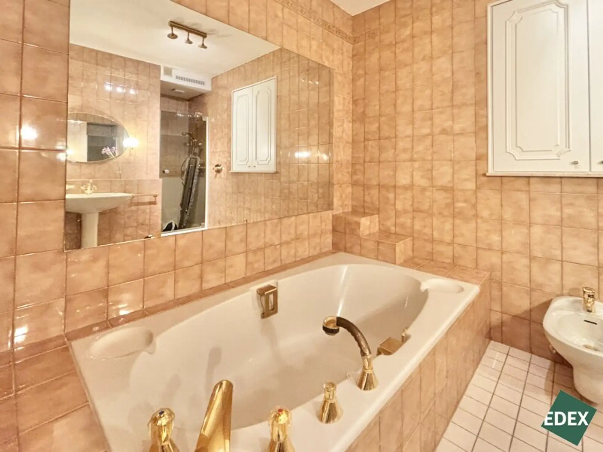 ein luxuriöses Badezimmer mit Eckbadewanne, Dusche, Doppelwaschbecken und Bidet