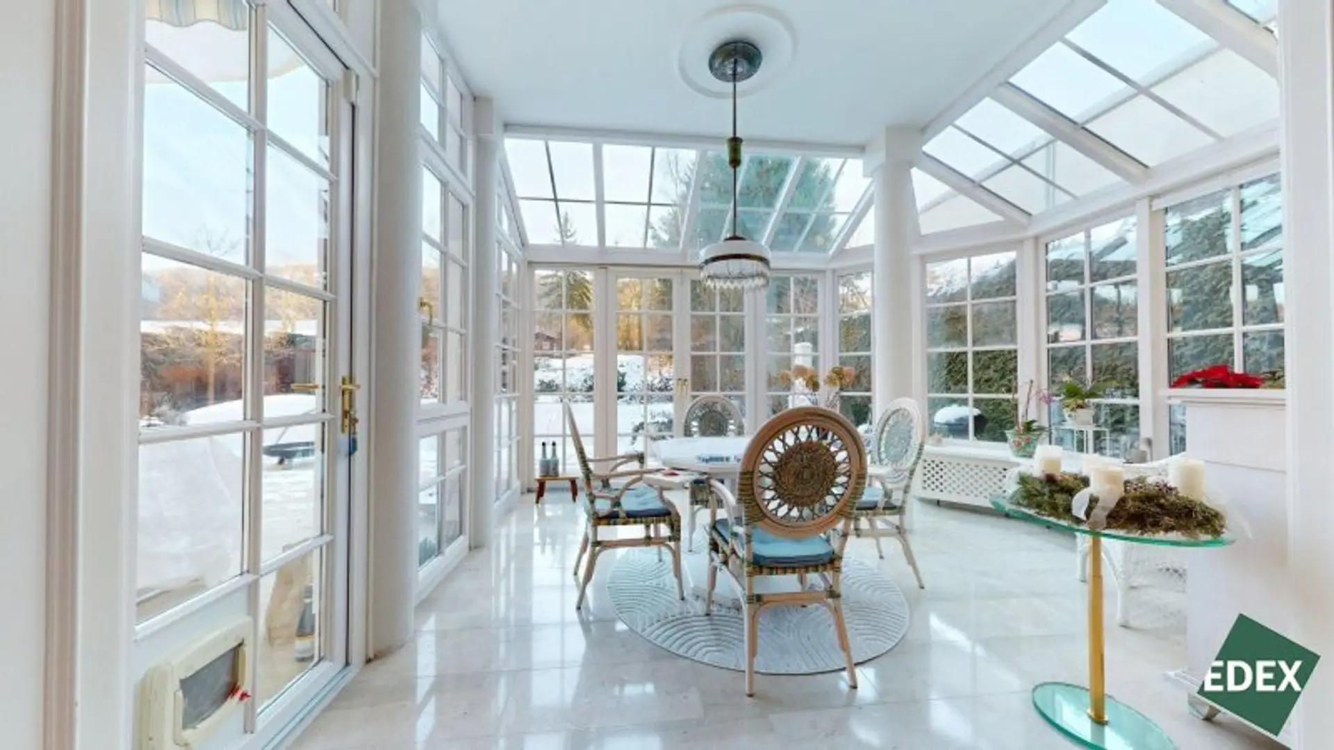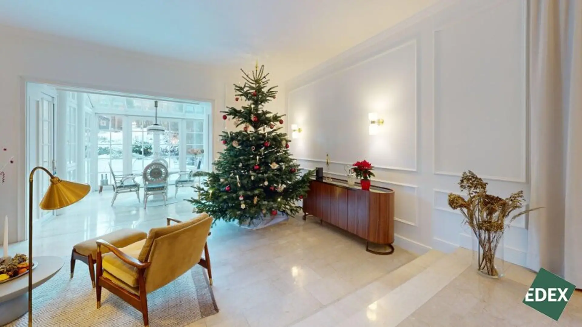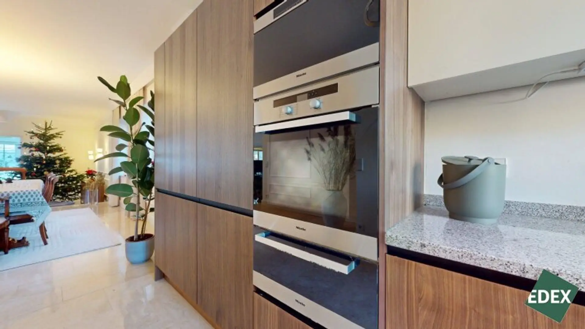 Bereits das Entree mit Garderobe und der repräsentativen Treppe ins Obergeschoss vermittelt den eleganten Charakter des Hauses. Das Herzstück der Villa ist der weitläufige, lichtdurchflutete Wohn- und Essbereich mit Wintergarten. Große Glasflächen eröffnen einen herrlichen Blick in den Garten und schaffen eine fließende Verbindung zwischen Innen- und Außenraum. Die neue, moderne Küche ist mit hochwertigen Miele-Markengeräten ausgestattet und ideal für alle, die Wert auf Qualität und Design legen.