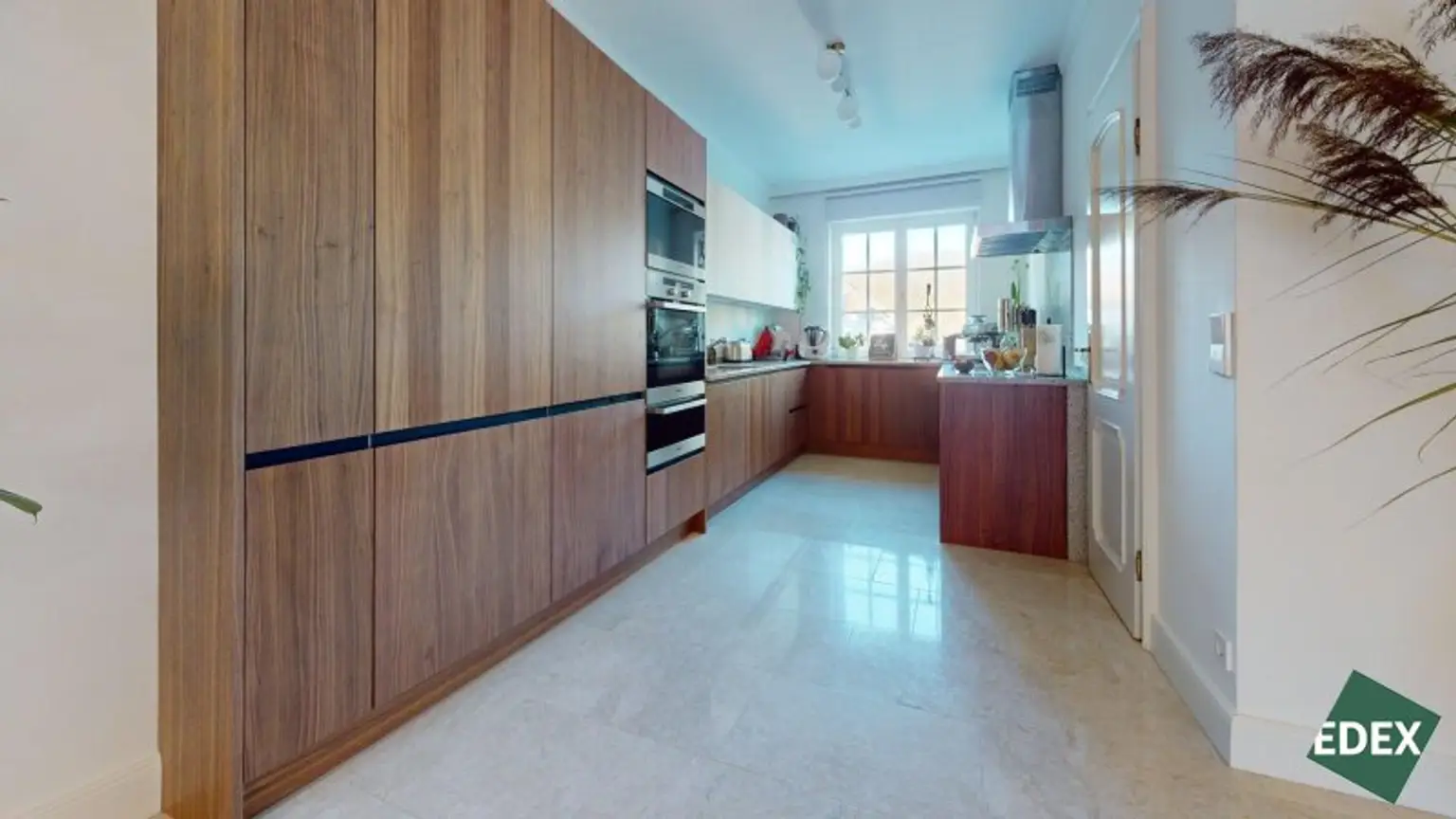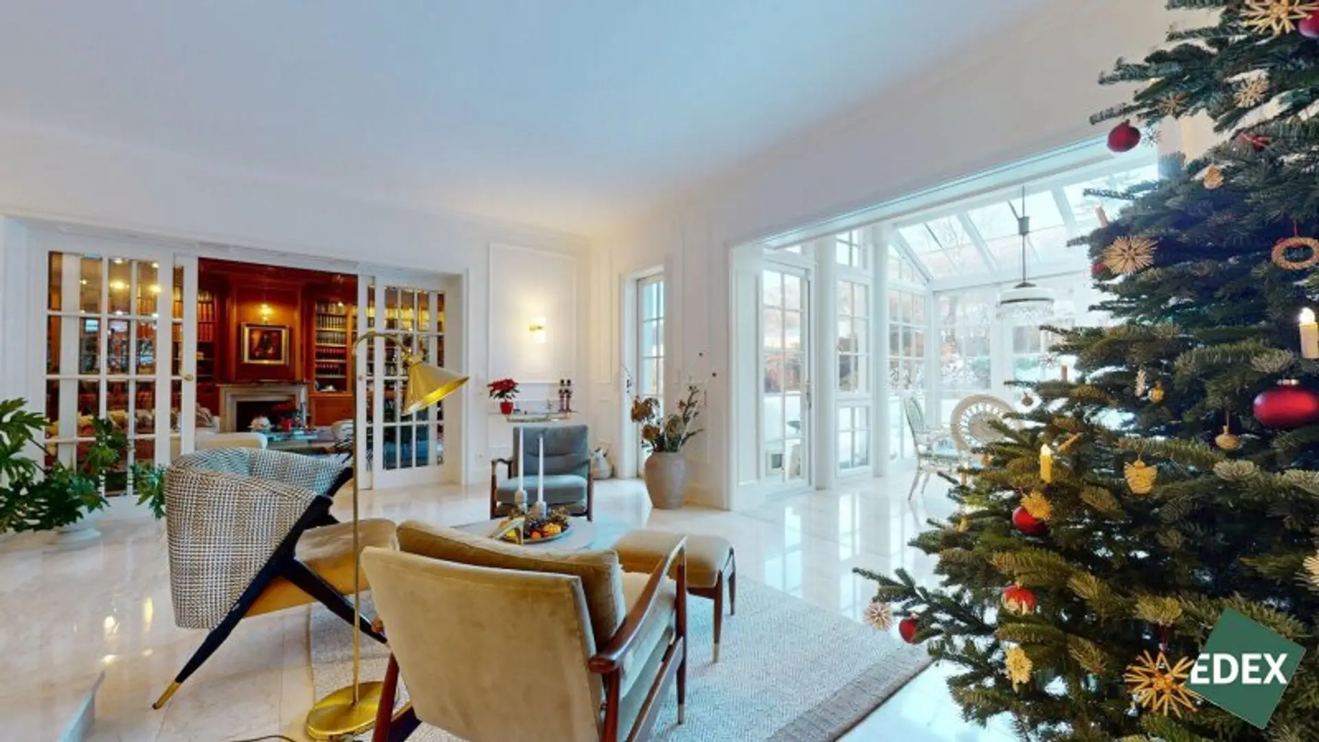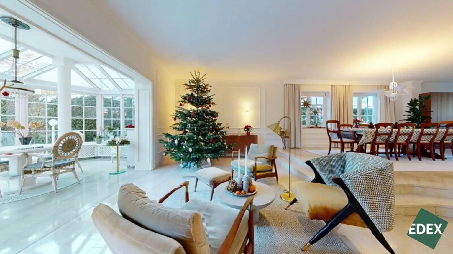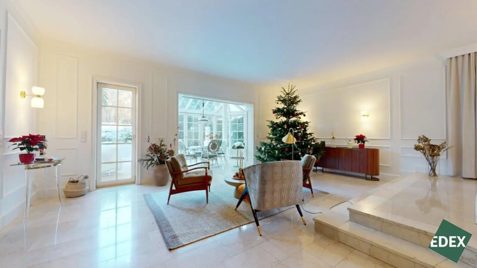 Bereits das Entree mit Garderobe und der repräsentativen Treppe ins Obergeschoss vermittelt den eleganten Charakter des Hauses. Das Herzstück der Villa ist der weitläufige, lichtdurchflutete Wohn- und Essbereich mit Wintergarten. Große Glasflächen eröffnen einen herrlichen Blick in den Garten und schaffen eine fließende Verbindung zwischen Innen- und Außenraum. Die neue, moderne Küche ist mit hochwertigen Miele-Markengeräten ausgestattet und ideal für alle, die Wert auf Qualität und Design legen.