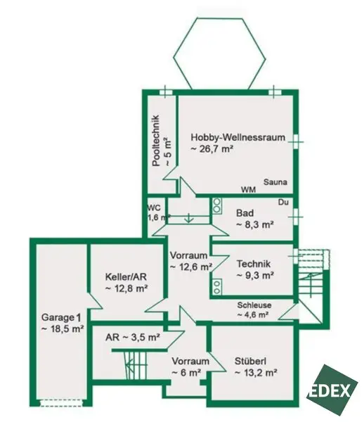 Im beheizten Keller erwartet Sie ein großzügiger Wellnessbereich mit Sauna, Dusche und WC sowie Fitnessgeräten. Ein gemütliches Kellerstüberl, diverse Lagerräume und der Raum mit dem Gaskessel ergänzen das Untergeschoss. Ein direkter Ausgang führt in den Garten und zur Garage – komfortabel und praktisch zugleich.