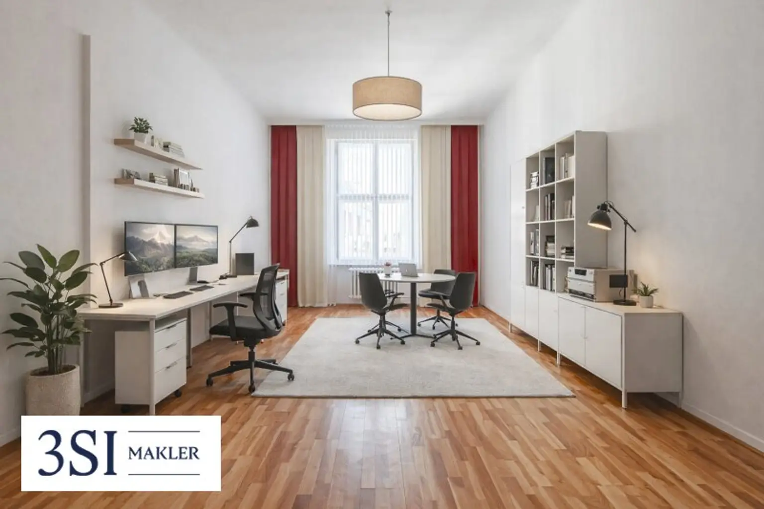 Die Einheit wird leer inkl. der abgebildeten Einbauküche übergeben. Die gezeigte Büroausstattung stellt lediglich einen Möblierungsvorschlag dar.
