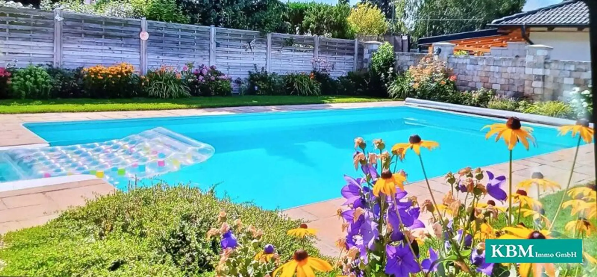 Auch der Außenbereich lässt keine Wünsche offen: Der stilvoll angelegte Garten mit Pool und großzügiger Terrasse lädt zu entspannten Stunden und geselligen Abenden ein.