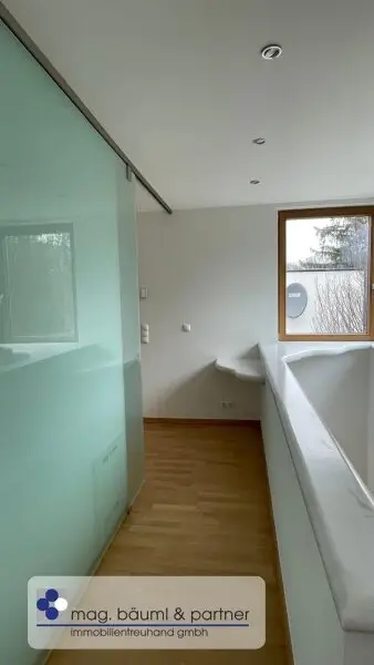 Im Obergeschoss sind 2 Zimmer und ein Badezimmer mit Wanne - durch Glasschiebetüren hat es eine angenehme Leichtigkeit.