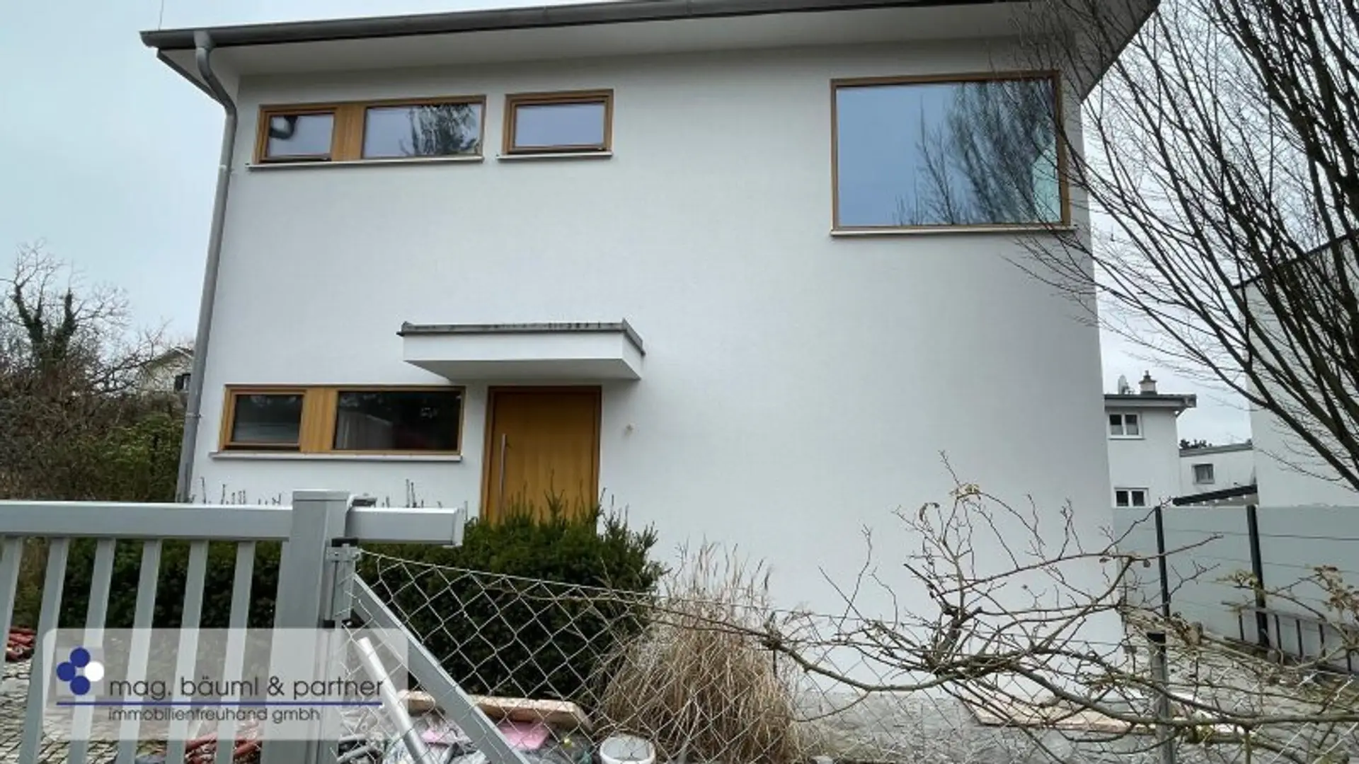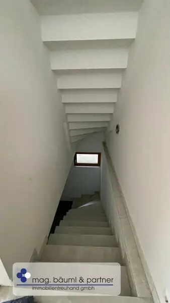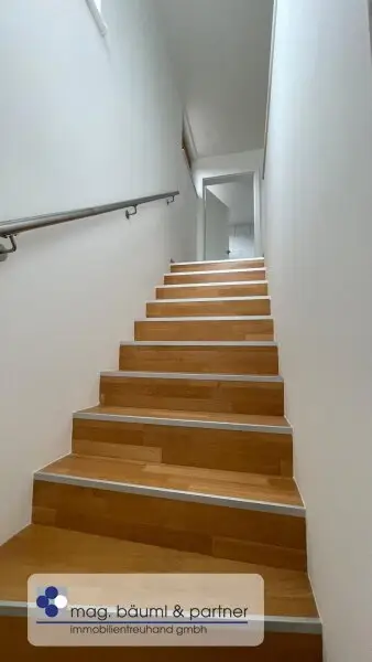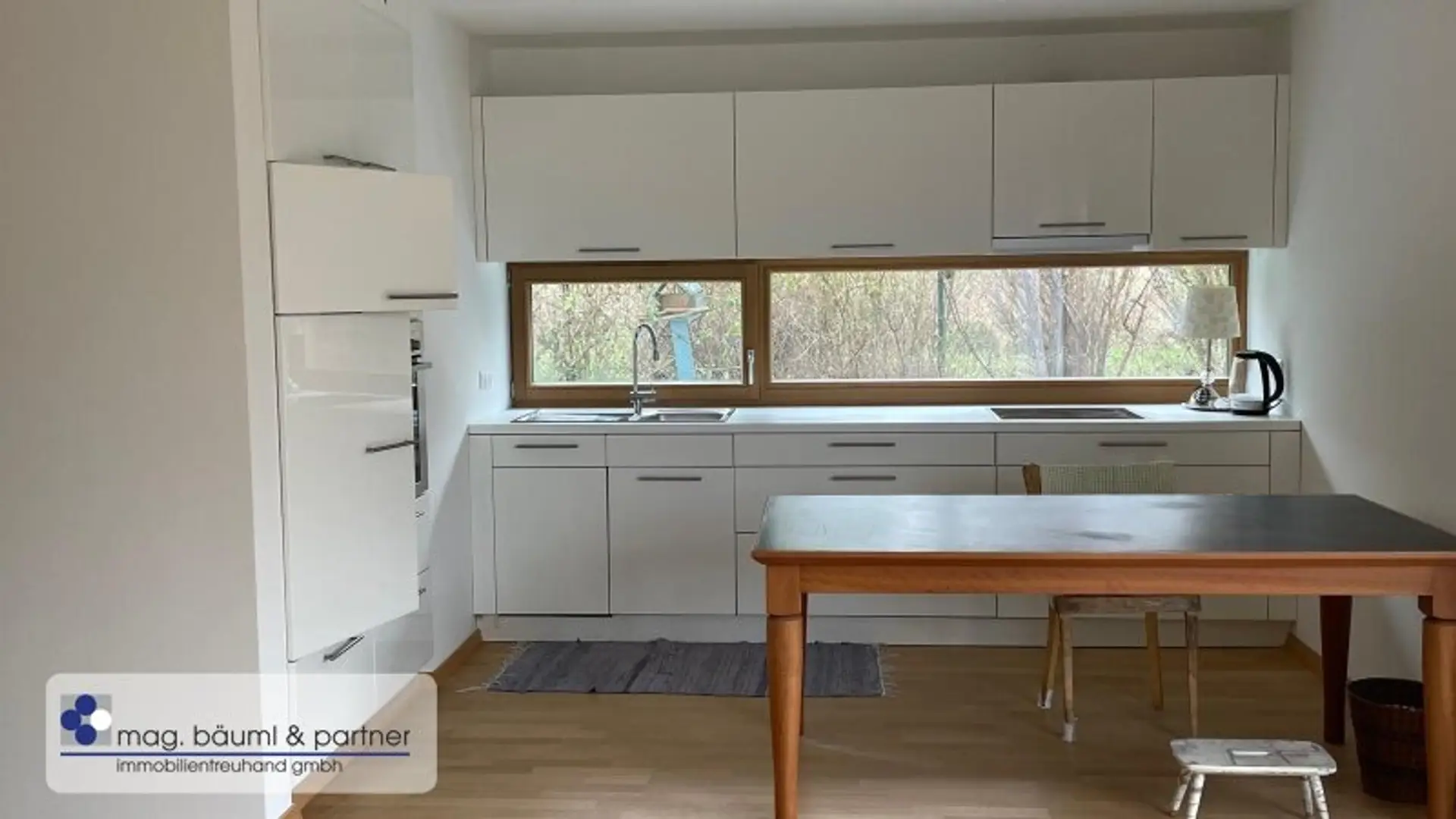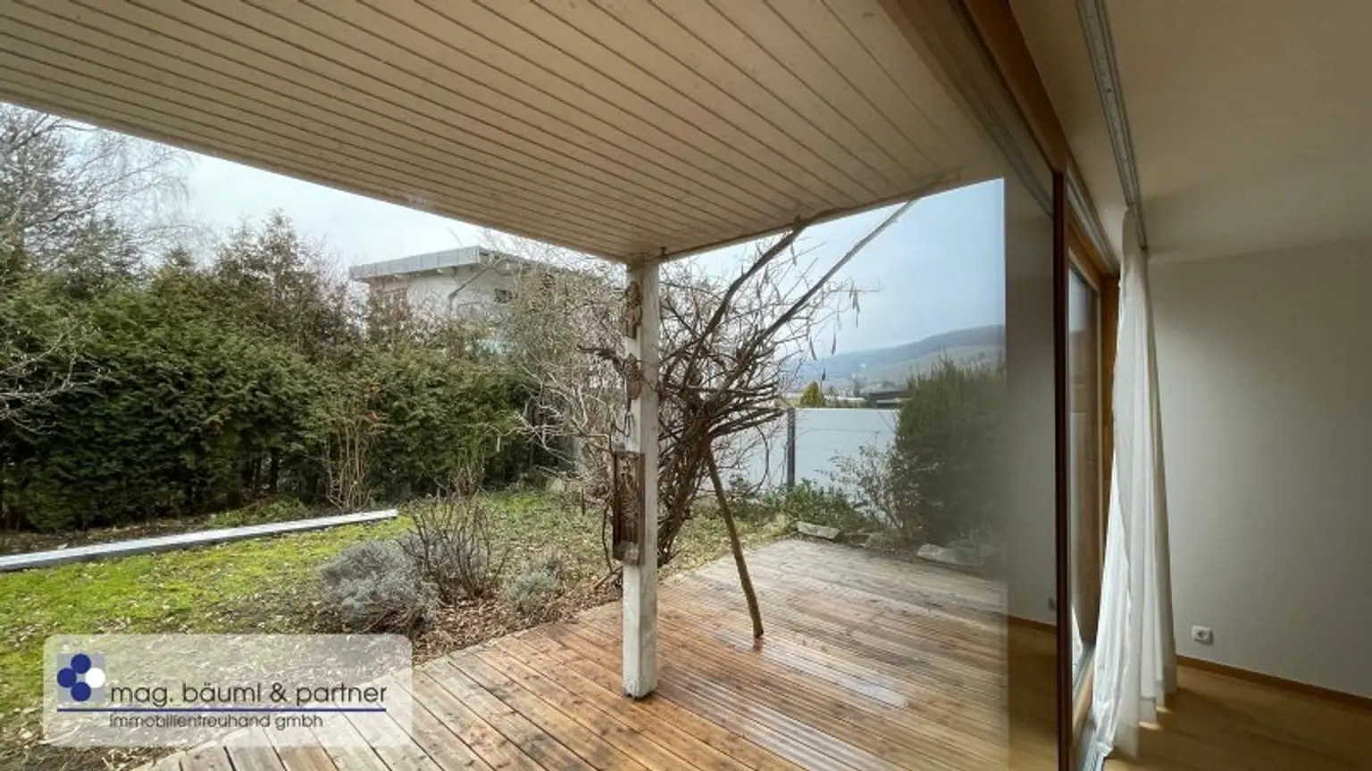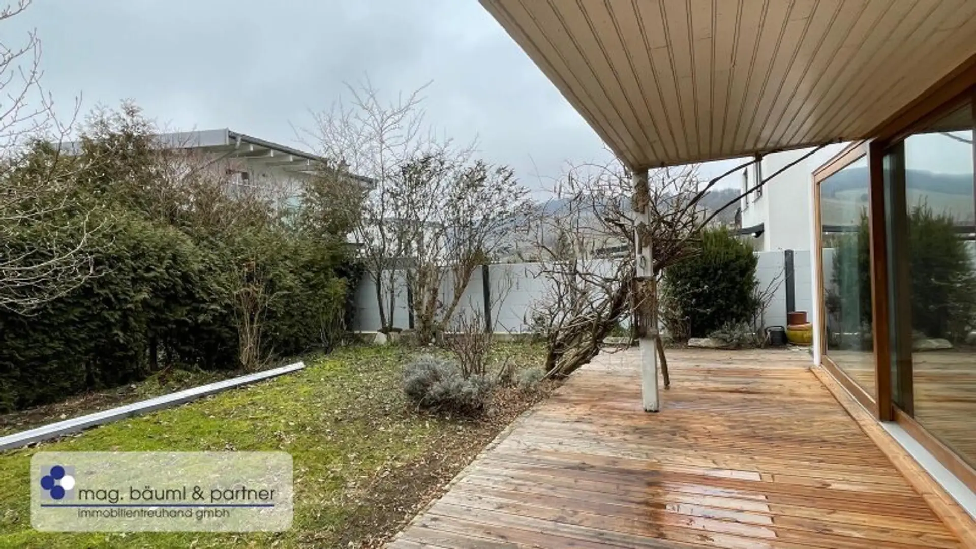 Eine Holzsicherheitstüre lässt den Bewohner in einen Vorraum und mit Garderobe eintreten und zentral von hier geht eine freischwebende Treppe in das Atelier oder Home-office hinunter- und weiter in den zentralen Wohnraum mit einer überkompletten Küchenzeile und genug Platz für einen langen Esstisch. Die gesamte QUERFRONT ist eine Glaswand - die Sonnenlicht und Wolkenstimmungen in den Wohnraum lässt. Vor gelagert ist die Holzterasse mit Teils Überdachung und Freifläche . Das Grün des Gartens ist ein Labsal für die Augen .
