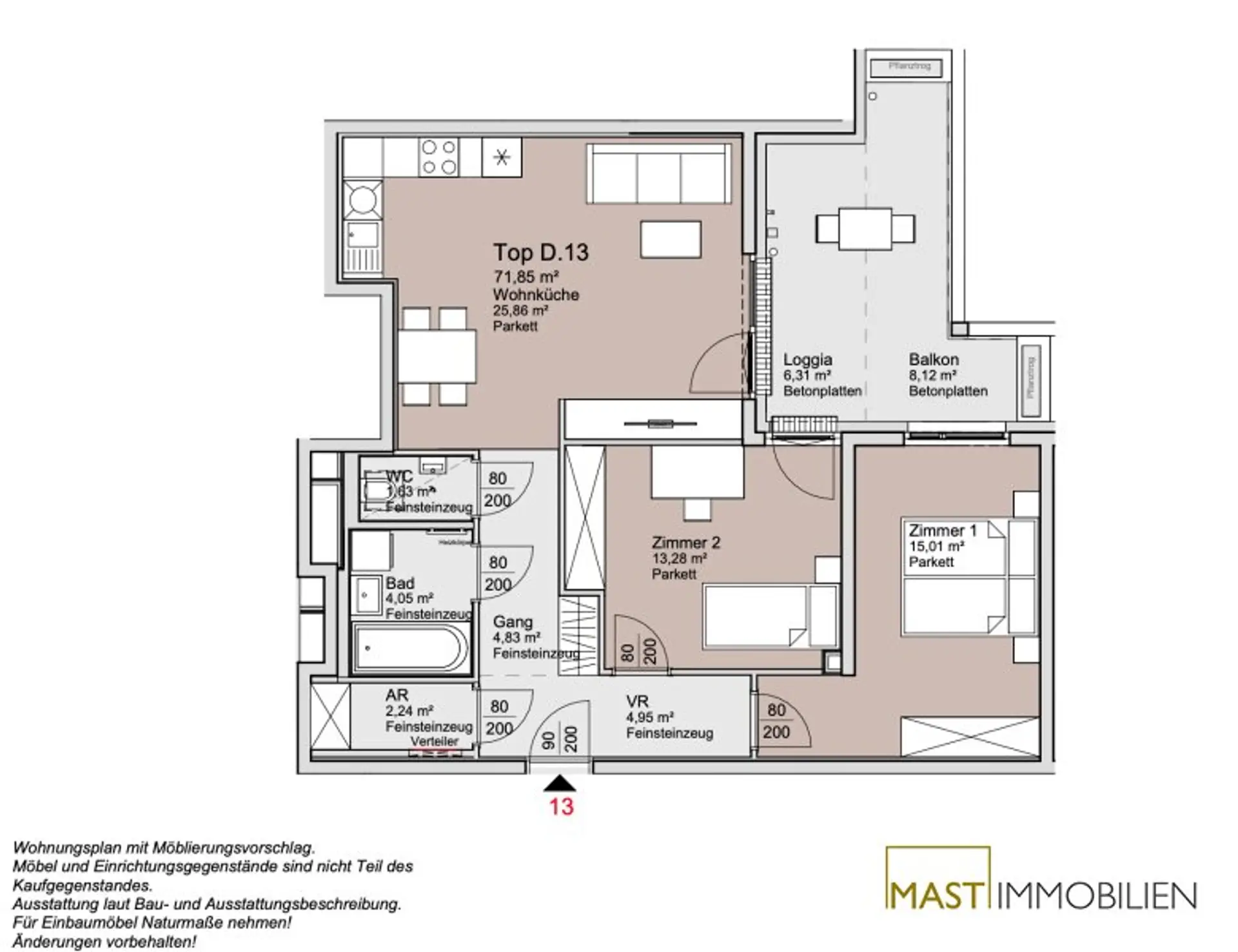 Die Wohnung befindet sich im 2. Liftstock und verfügt über 71,85 m² Wohnfläche + einen 8,12 m² großen Balkon + 6,31 m² Loggia.