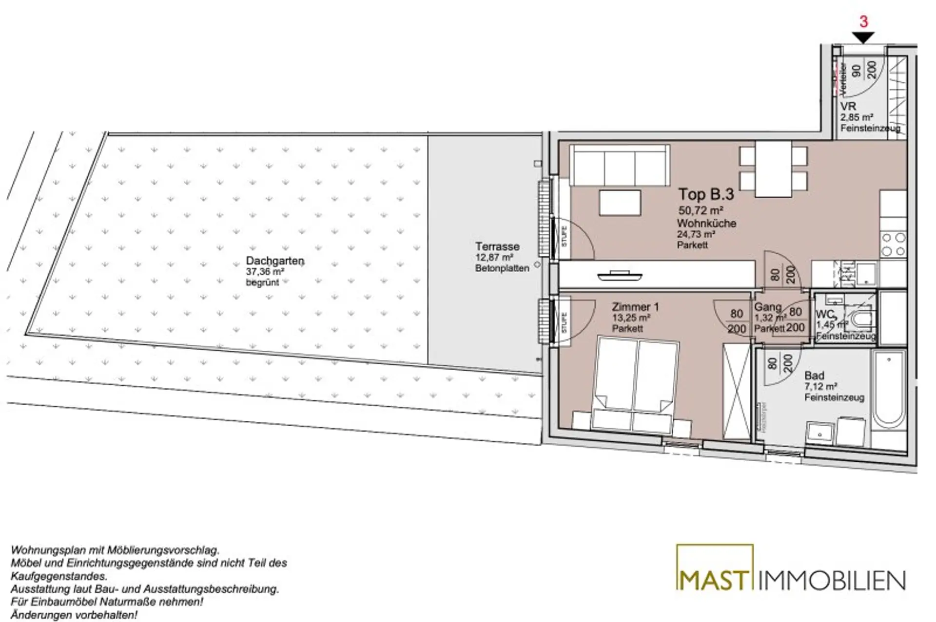 Die Wohnung befindet sich im 1. Liftstock und verfügt über 50,72 m² Wohnfläche + eine 12,87 m² große Terrasse + ein 37,36 m² großer Dachgarten .