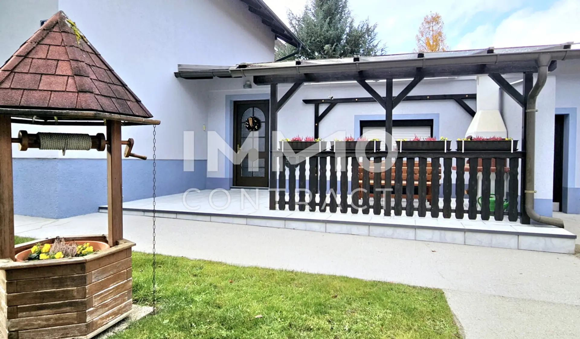 Eine überdachte Terrasse vor dem Haus, direkt neben dem Eingang, erweitert den Wohnbereich nach außen und lädt zu ruhigen Stunden im Garten ein.