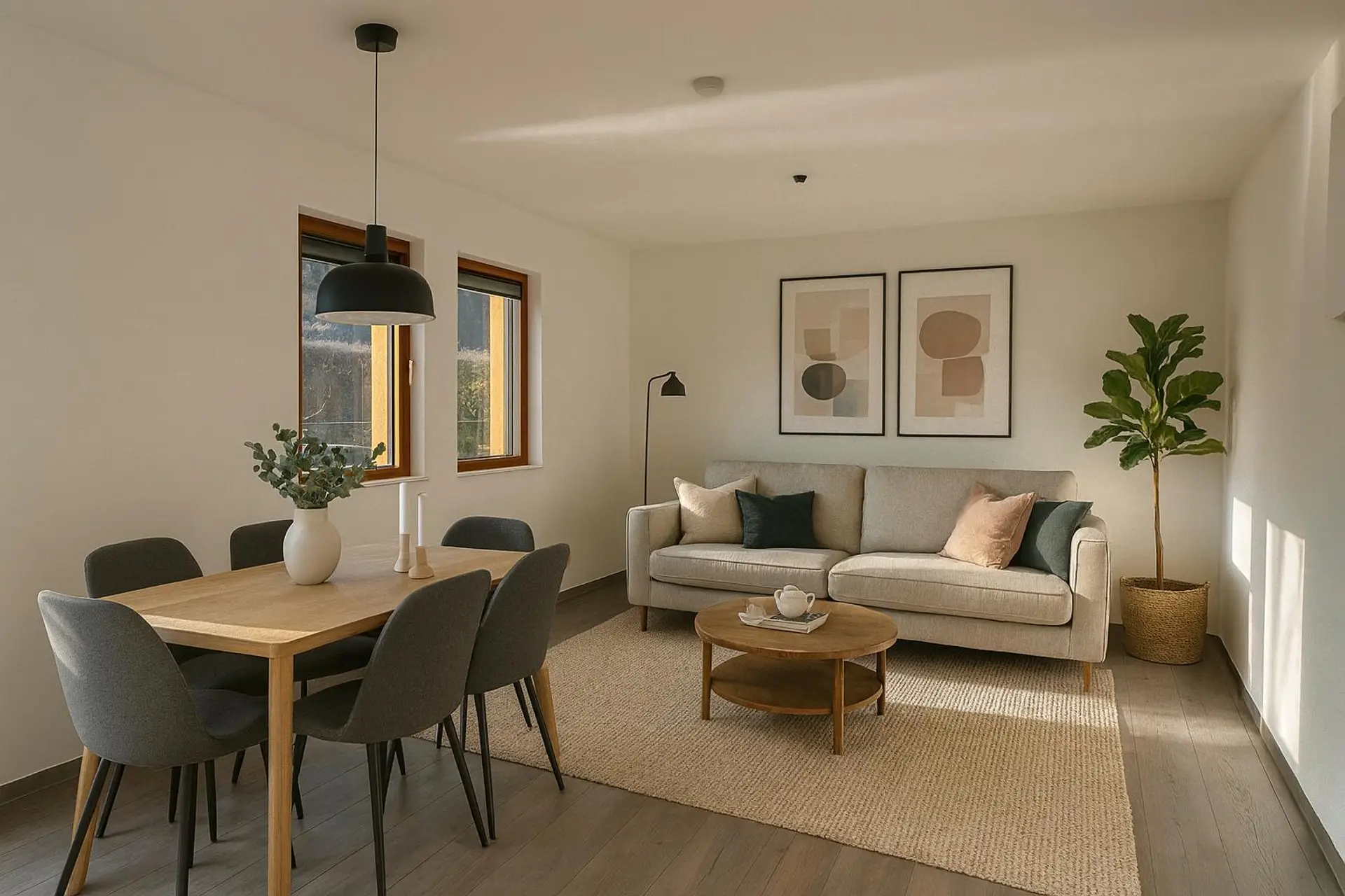 Der sonnige Wohn-Essbereich wirkt einladend und schafft durch große Fensterflächen eine freundliche, helle Atmosphäre. Die funktionale Aufteilung, eine offene Küche sowie das renovierte Badezimmer unterstreichen den praktischen Wohnkomfort. Die Passivhaus-Bauweise sorgt zuverlässig für niedrige Betriebskosten und ein ausgeglichenes Raumklima.