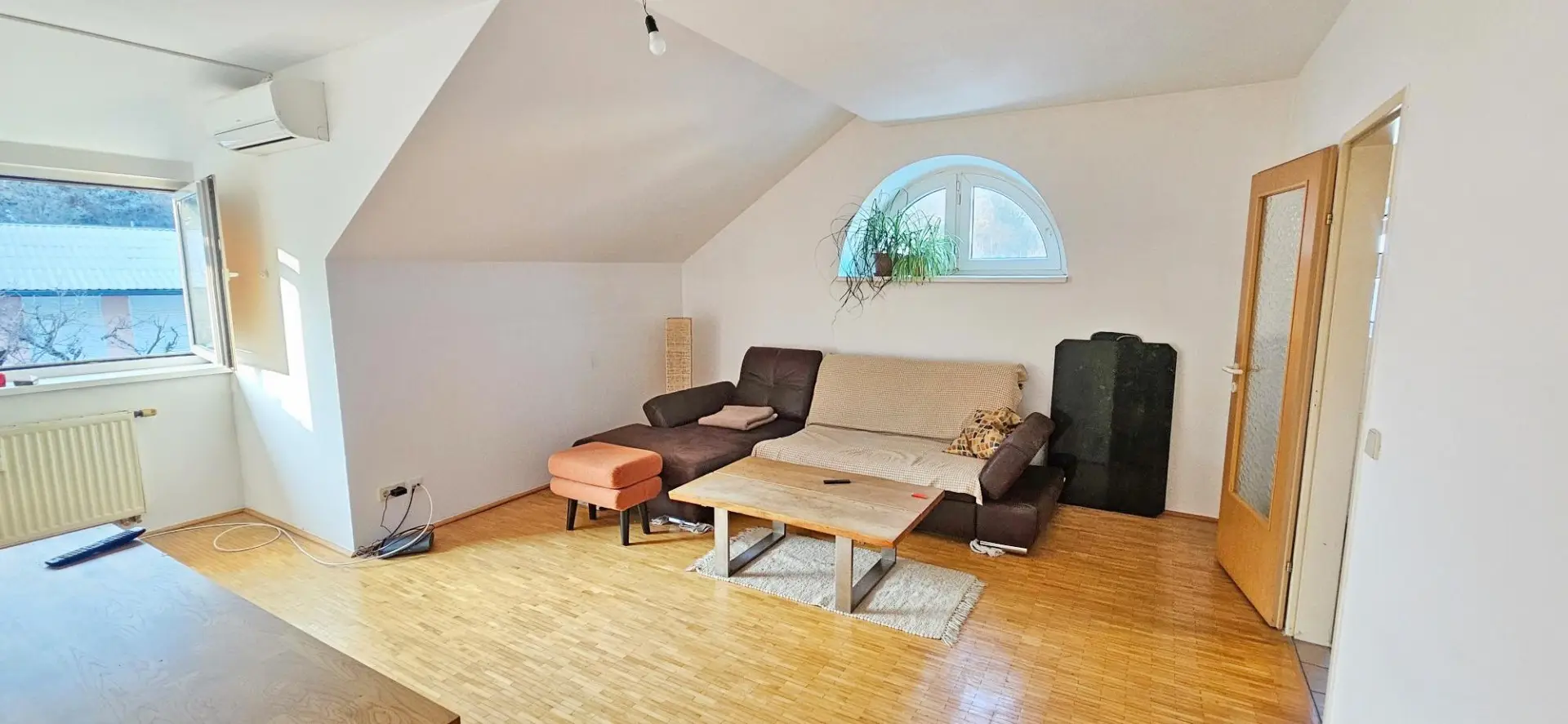 Das großzügige, helle Wohnzimmer lädt zum Verweilen ein, während das Schlafzimmer mit charmanter Dachschräge für eine gemütliche Atmosphäre sorgt. Hochwertige Parkettböden sowie eine Klimaanlage unterstreichen den Wohnkomfort.