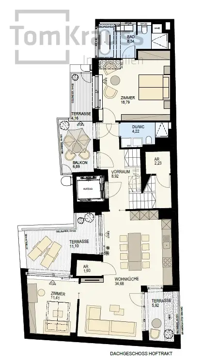 Zum Verkauf gelangt eine einzigartige Dachterrassenwohnung im Dachgeschoss des Hofgebäudes. Die Wohnung erreichen Sie bequem mit dem Lift, der Sie direkt in den Vorraum bringt. Von dort führt eine Treppe in den zentral begehbaren Vorraum.