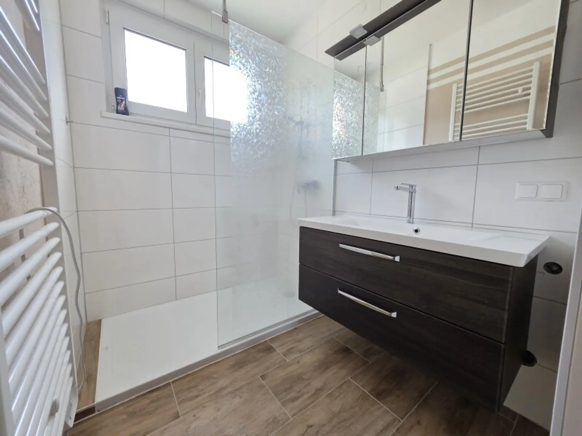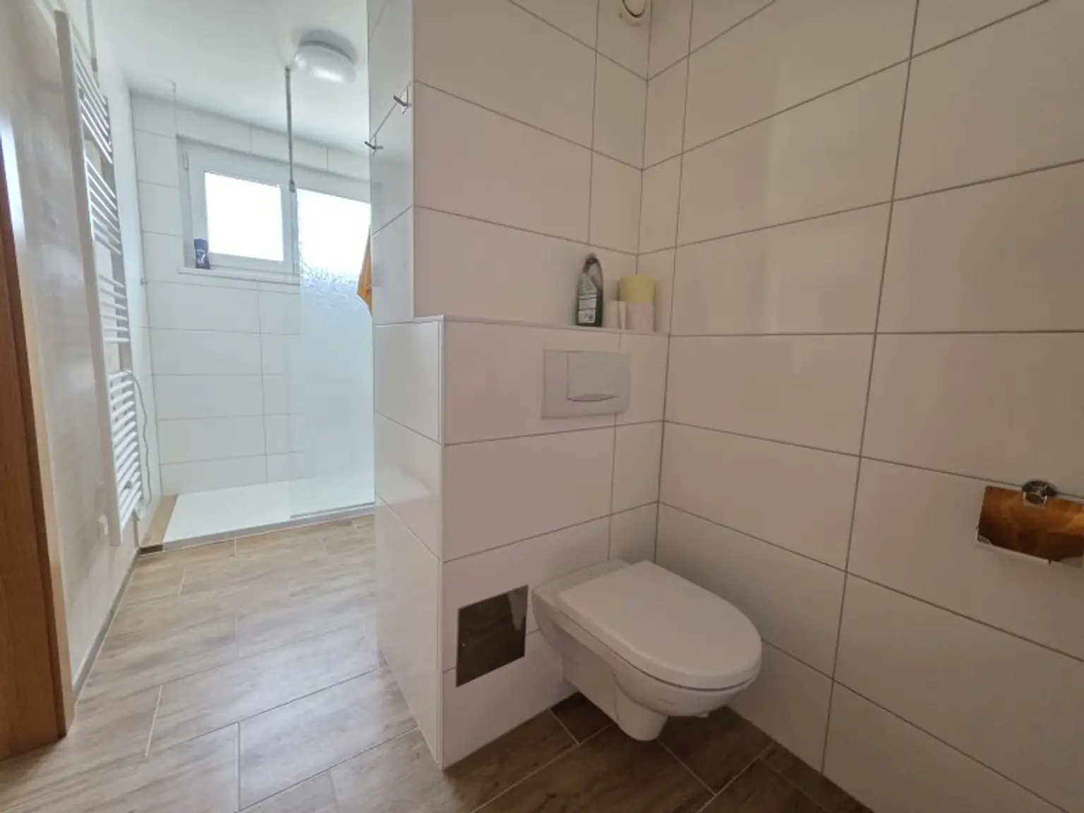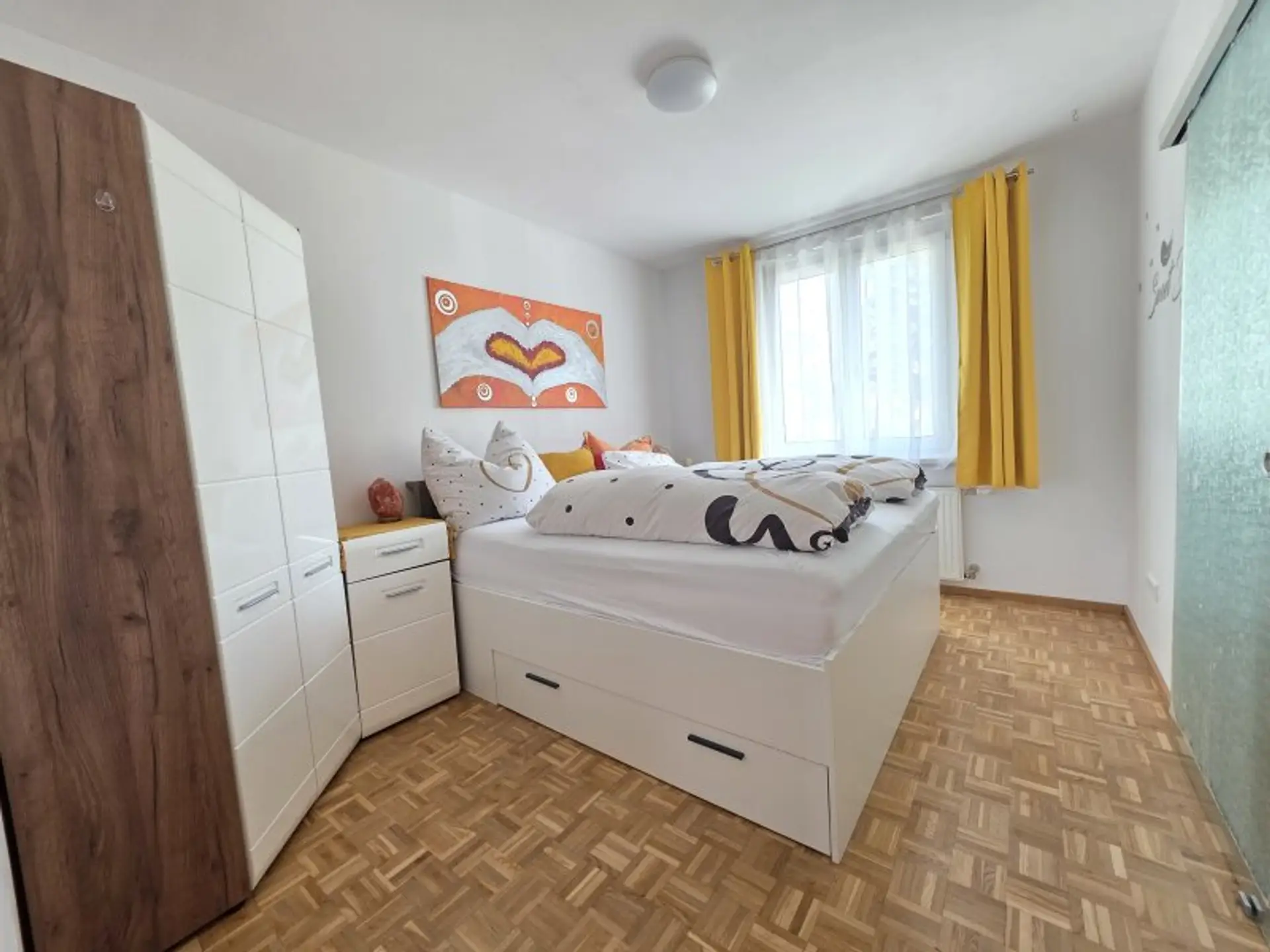 Ein besonderes Highlight ist das praktisch gestaltete Badezimmer, das sowohl vom Vorraum als auch direkt vom Schlafzimmer über eine Schiebetür zugänglich ist. Diese durchdachte Lösung sorgt für zusätzlichen Komfort und Privatsphäre.