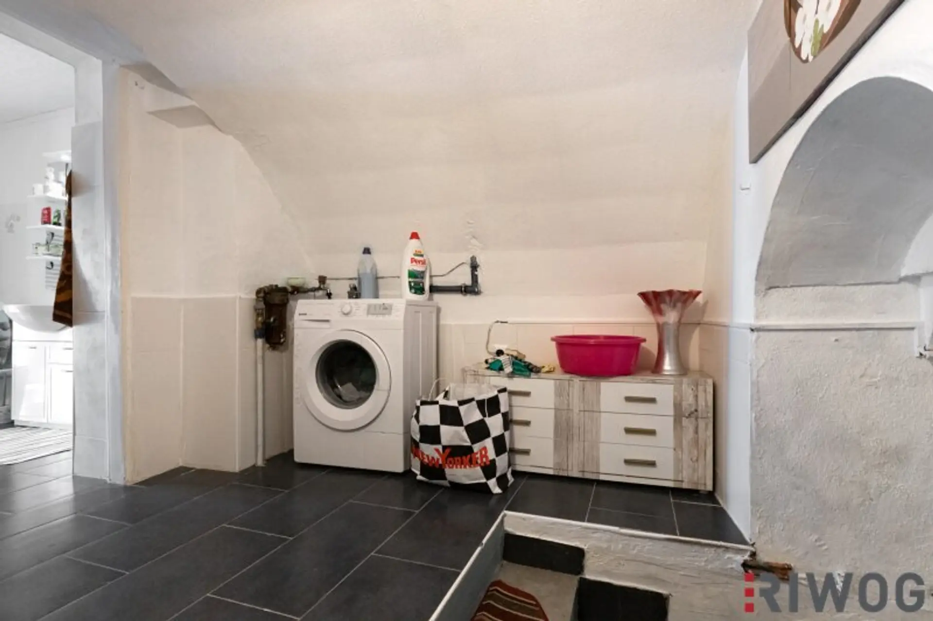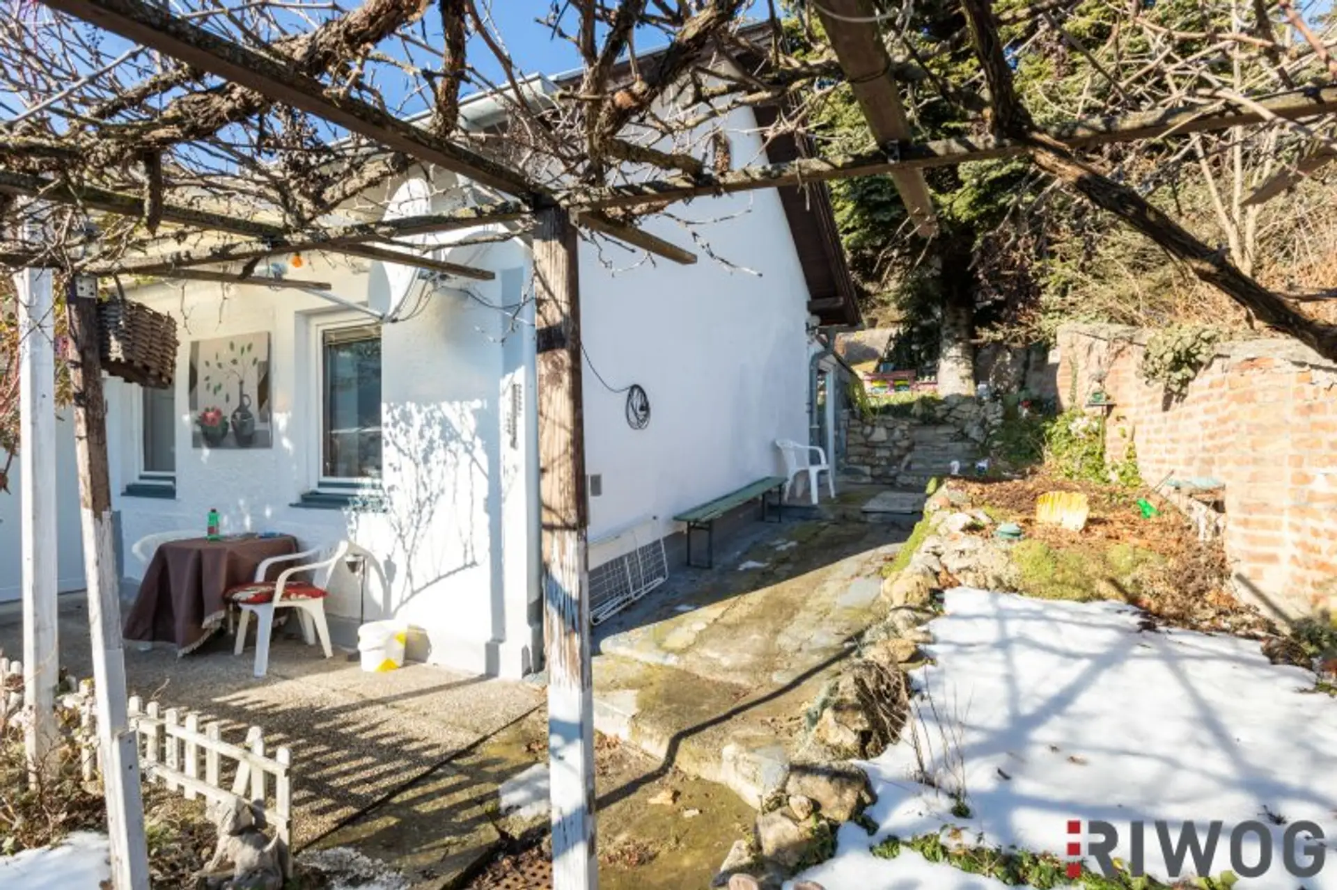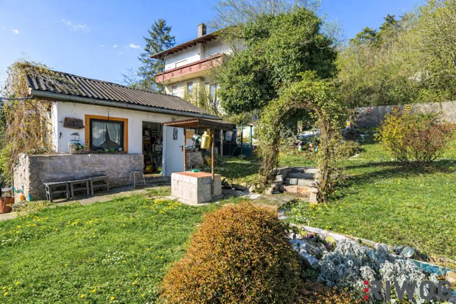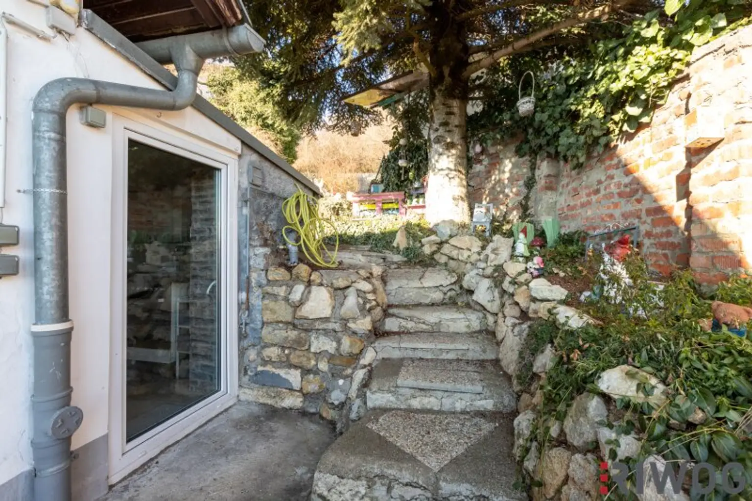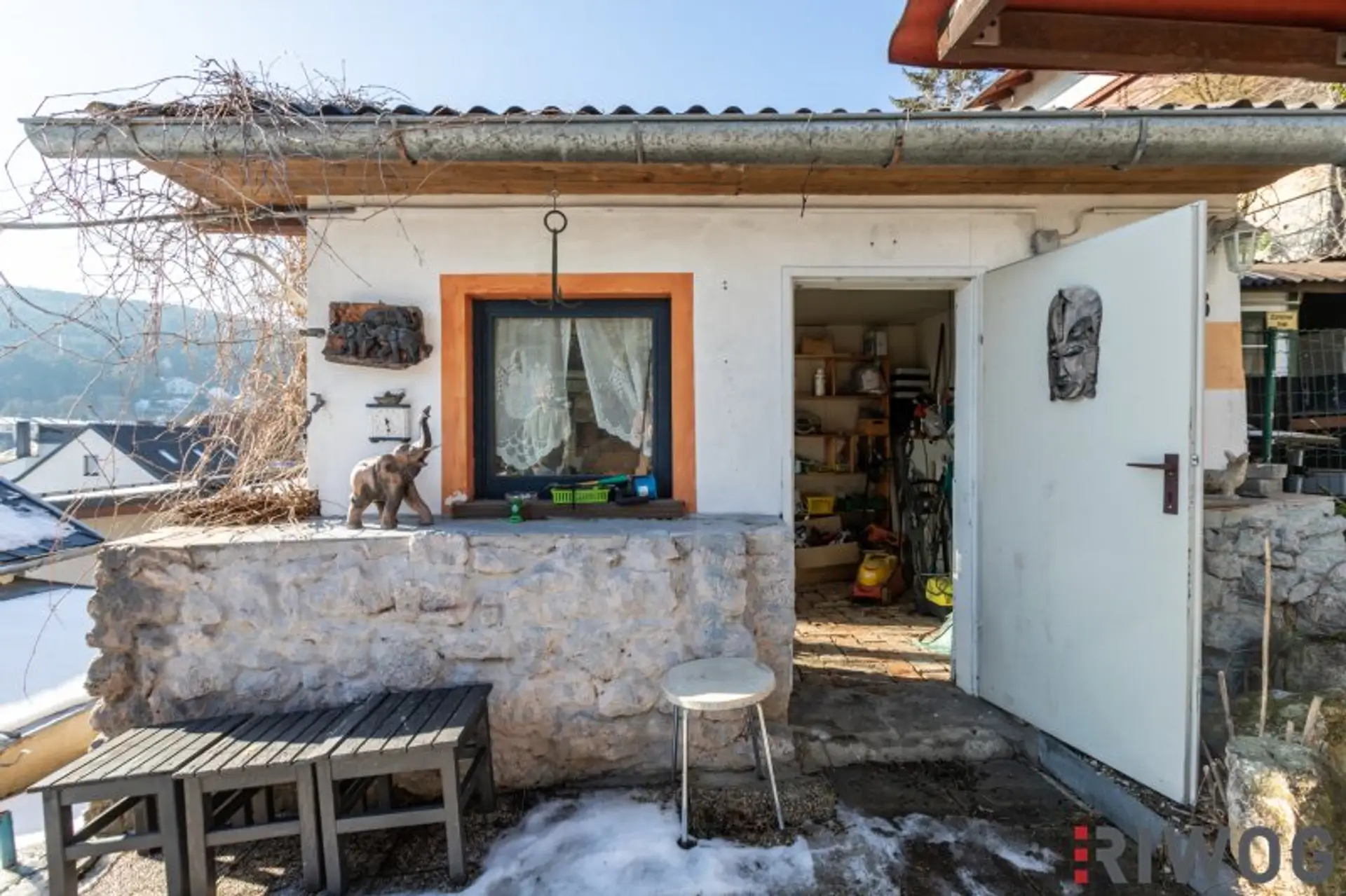 Bedingt durch die Hanglage gelangt man zum Dachoboden von Außen über Stufen hinauf zum Garten. Dort befindet sich auch eine Terrasse sowie eine kleine eine Grill- oder Hobbyhütte und im Anschluss ein Werkzeug- und Geräteschupfen den Sie bei Bedarf vielleicht auch für die Tierhaltung z.B. als Hühnerstall nutzen können. Von der Terrasse gelangt man seitlich entlang der Grundstückgrenze zum Abstellraum auf Wohnebene der sich hinter dem Schlafzimmer befindet. Im Haus gelangt man direkt nach dem Badezimmer und die Stufen hinunter in das alte Kellergewölbe welches sich auch bestimmt perfekt als Weinkeller eignet oder wo man sich vielleicht auch den Traum einer eigenen Wellnessoase nach einem Umbau erfüllen kann. Es gibt einfach so viele Gestaltungs- und Umbaumöglichkeiten bei diesem Haus die man einfach gesehen haben muss um der Fantasie freien Lauf zu lassen.