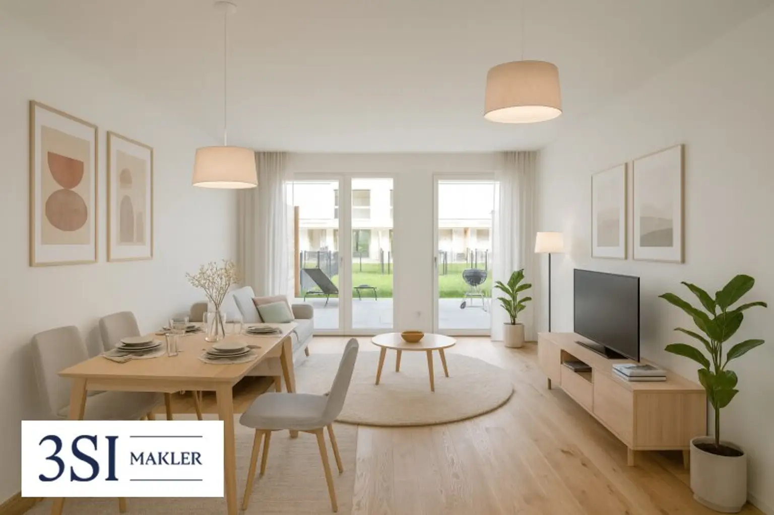 Diese moderne Gartenwohnung verfügt über 2 Zimmer und rund 63 m² Wohnfläche zzgl. rund 21 m² Terrassenfläche sowie zzgl. rund 57 m² Gartenfläche. Sie besticht durch ihren großzügigen Grundriss und teilt sich wie folgt auf: