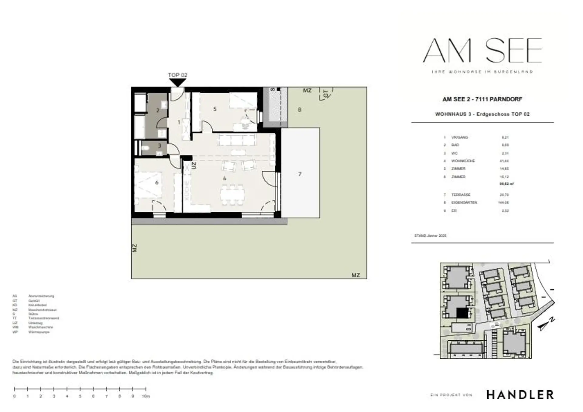 Die Wohnung Top 02 im Erdgeschoss von Wohnhaus 3 besticht durch ihre großzügige Raumaufteilung und den weitläufigen Außenbereich. Auf rund 90 m² Wohnfläche finden sich ein offener Wohn- und Essbereich mit Küche, zwei Schlafzimmer, ein Badezimmer, ein separates WC sowie ein praktischer Vorraum. Die großen Fensterflächen lassen viel Licht herein und schaffen ein freundliches Wohnambiente.