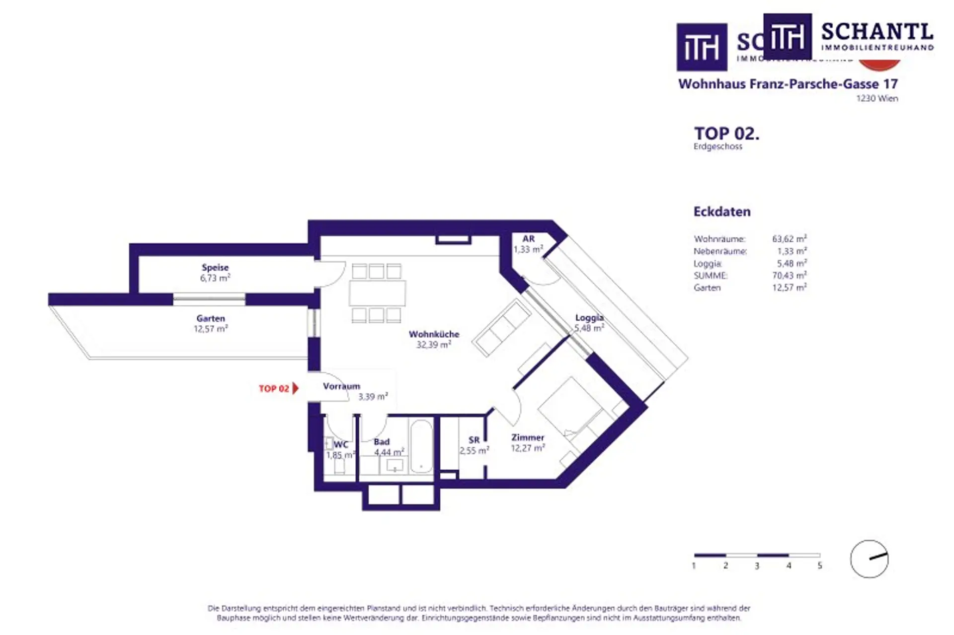 Willkommen im _frechen FRANZ! _– einem stilvollen Neubauprojekt in der ruhigen Franz-Parsche-Gasse im 23. Bezirk. Die Wohnung Top 2 liegt im Erdgeschoss und bietet modernen Wohnkomfort auf ca. 63 m² Wohnfläche, ergänzt durch einen ca. 12 m² großen Eigengarten sowie einer Loggia mit ca. 5,5 m².