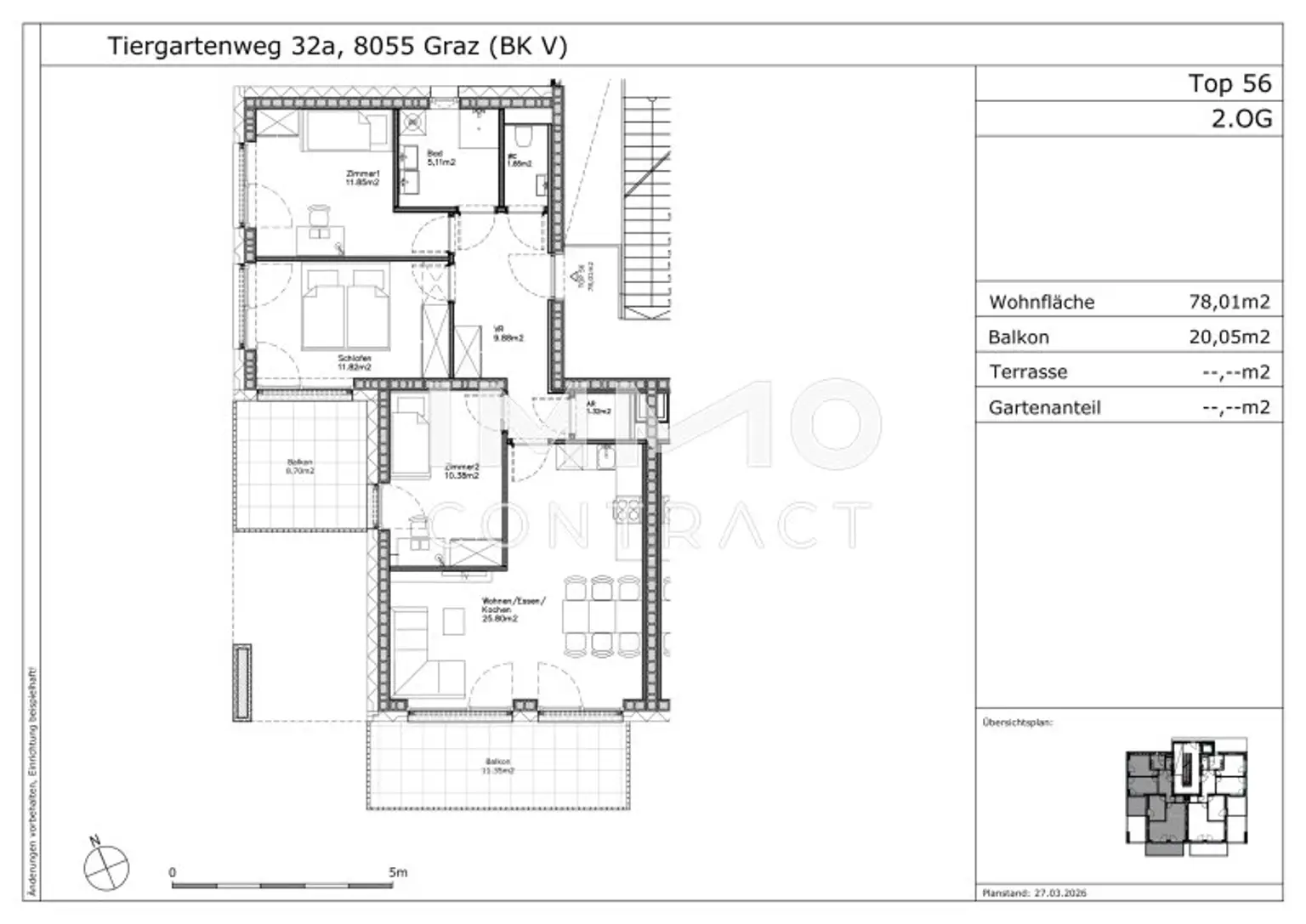Diese ca. 78,01m² große, geförderte Wohnung befindet sich im 1. Obergeschoß des Hauses Tiergartenweg 32a in einem modernen, neu errichteten Wohnhaus.