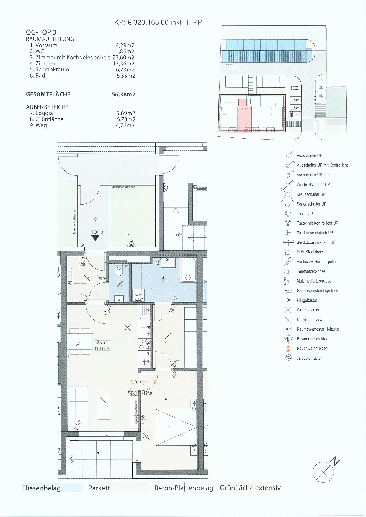 Die Wohnung überzeugt durch eine durchdachte Raumaufteilung, helle Wohnräume sowie einen großzügigen Außenbereich mit Loggia ( 5,69m²) und Grünflächen. Ein zugehöriger Parkplatz ist im Angebot inkludiert.