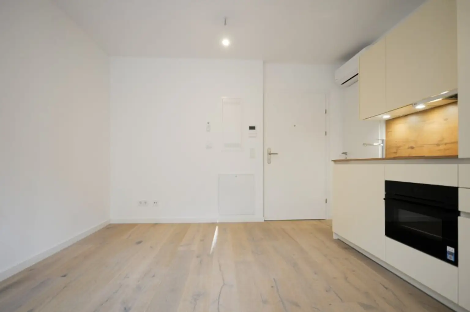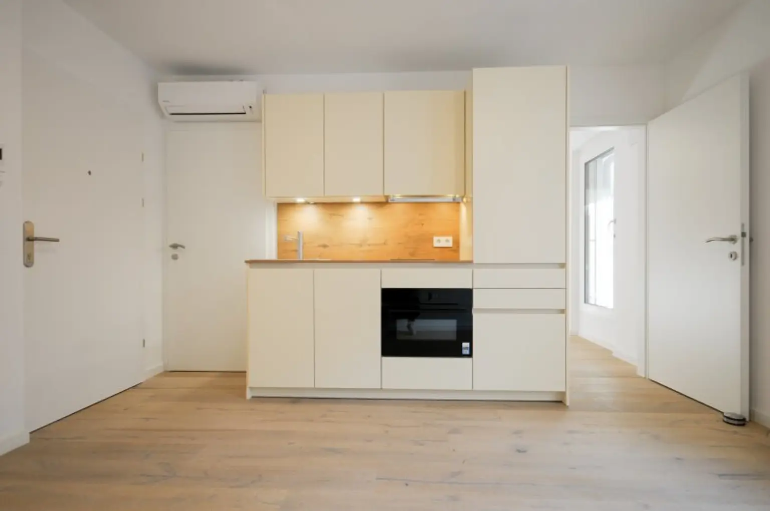 Gleich nach dem Eintreten in die rund 30 m² große 2 - Zimmer - Wohnung schweift der Blick in die offen gestaltete Wohnküche. Gut gelegen im Eingangsbereich liegt die Toilette mit kleinem Handwaschbecken. Der Wohn- und Essbereich ist mit 15 m² kompakt, aufgrund der quadratischen Dimensionierung dennoch ideal geschnitten um Möbel gut zu positionieren. So findet sich ausreichend Platz, für eine gemütliche Couch, Sideboards und einen Esstisch. Ein zeitloser Küchenblock mit sämtlichen Geräten ist selbstverständlich Teil der Ausstattung.