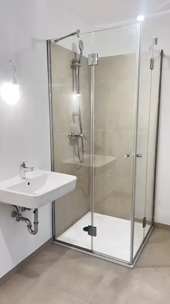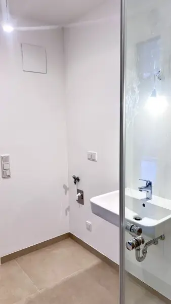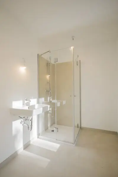 Das etwa 5 m² große Tageslicht-Badezimmer verfügt über eine Dusche, ein Handwaschbecken und einen Waschmaschinen-Anschluss. Dank der großen Fenster ist ein frisches Badezimmer-Klima immer garantiert.