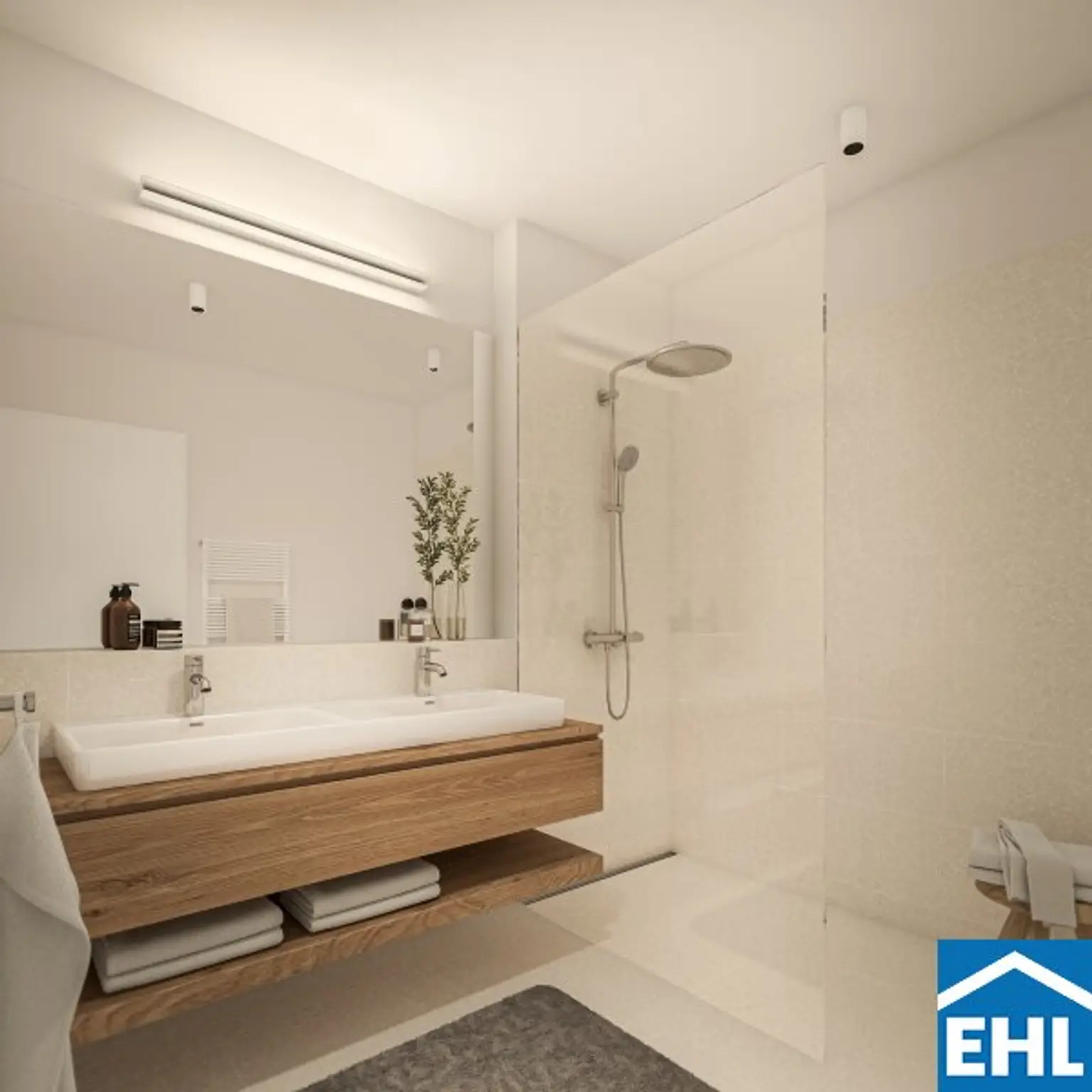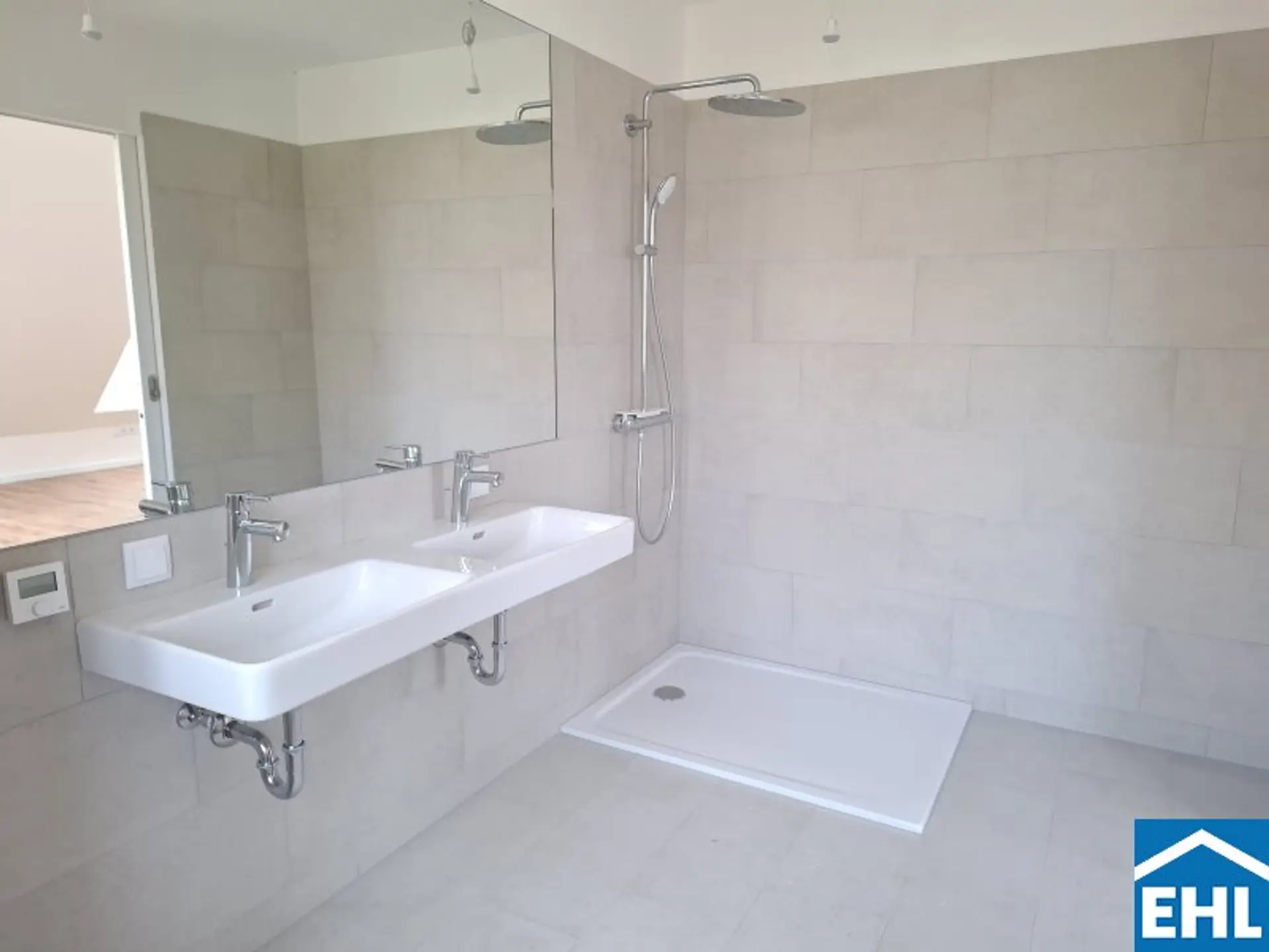Das Badezimmer ist modern ausgestattet und verfügt über eine Dusche, ein WC sowie einen Waschmaschinenanschluss. Hochwertige Materialien und eine zeitgemäße Ausführung unterstreichen den Neubaucharakter der Liegenschaft.