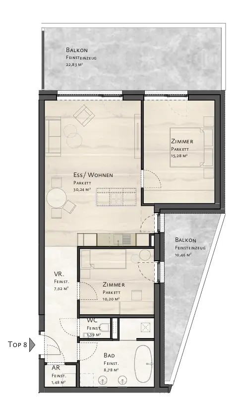 Die Wohnung verfügt über eine geräumige Ess-Wohnküche mit Balkonzugang, ein Schlafzimmer mit Balkonzugang, ein weiteres Zimmer als Büro oder Kinderzimmer mit Balkonzugang, einen Abstellraum, ein Badezimmer mit Dusche und Badewanne, eine separate Toilette sowie einen Vorraum.