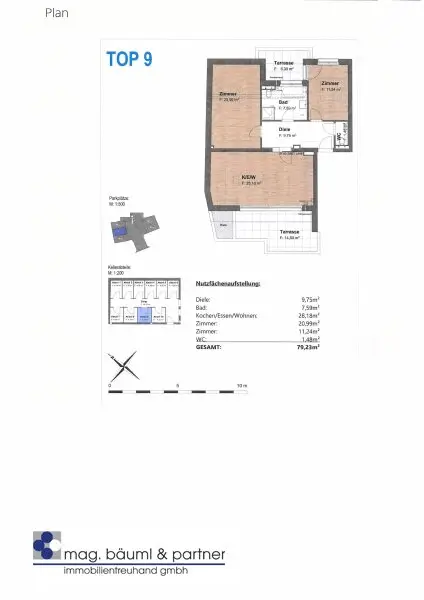 * Vorraum, Wohnzimmer, 2 Schlafzimmer, Badezimmer, WC, Terrasse