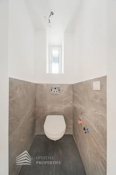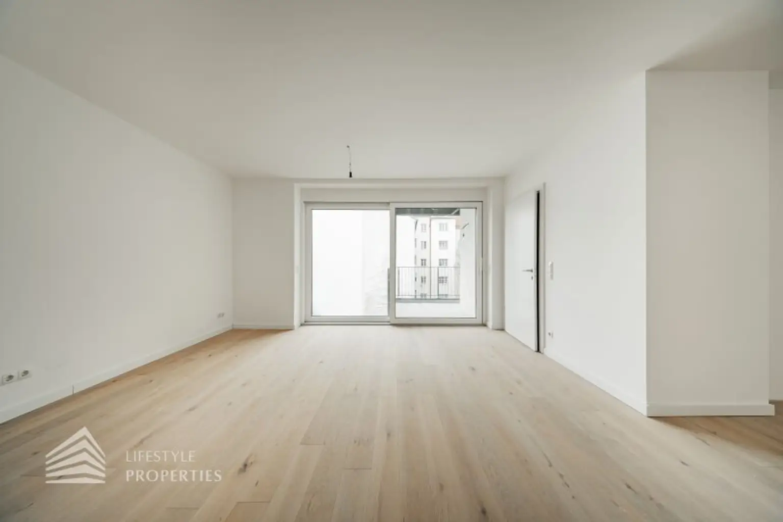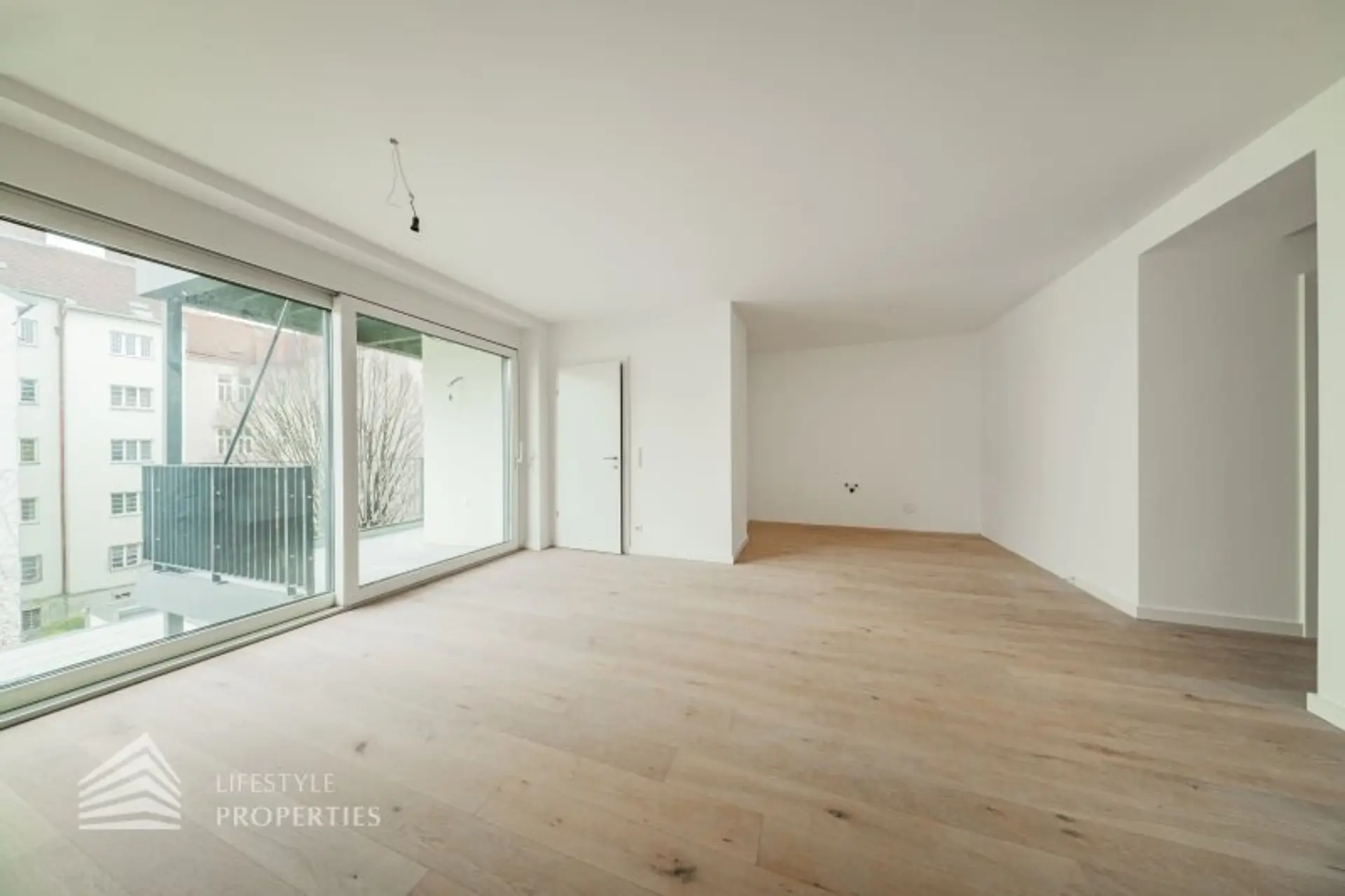 Der Vorraum bietet Platz für eine Garderobe und verfügt über eine praktische Nische mit Anschluss für eine Waschmaschine. Von hier aus gelangt man sowohl in die separate Gäste-Toilette mit Fenster und Handwaschbecken als auch in die großzügige Wohnküche. Diese öffnet sich zu einem ca. 9 m² großen, süd- und hofseitig ausgerichteten Balkon. Die Küchenanschlüsse werden individuell nach Käuferwunsch vorbereitet.Die beiden weiteren Zimmer sind zentral begehbar. Das moderne Badezimmer ist mit Dusche, WC und Waschbecken ausgestattet.