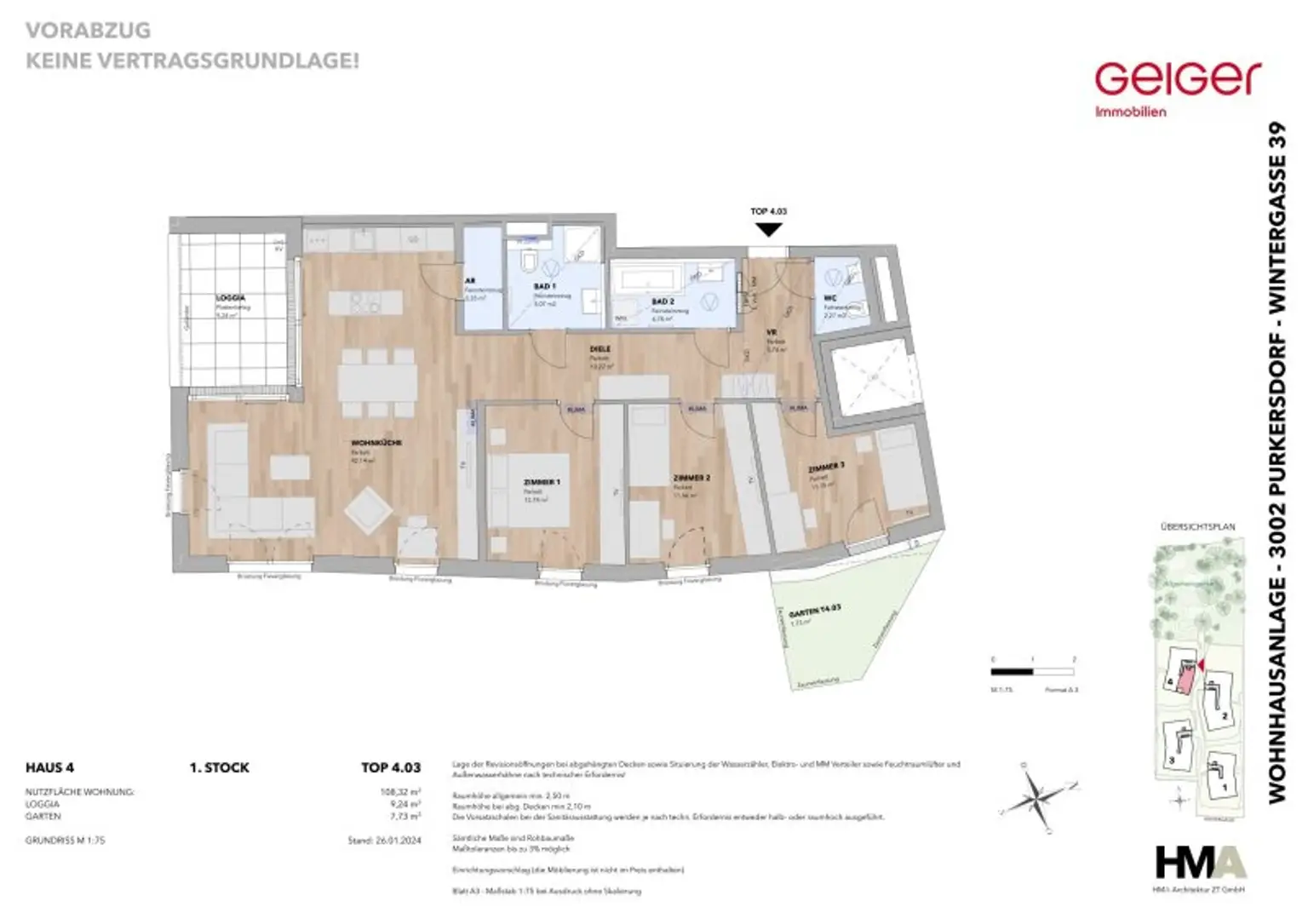 In der zentrumsnahen Wintergasse 39 im beliebten Purkersdorf, errichten wir eine moderne Wohnhausanlage. Diese fügt sich harmonisch in den Hang ein, besteht aus 4 Wohnhäusern mit insgesamt 48 Wohnungen (2-, 3-, 4- und 5-Zimmer Wohnungen), 74 KFZ-Tiefgaragenplätzen, sowie 8 Stellplätzen für Motorräder.