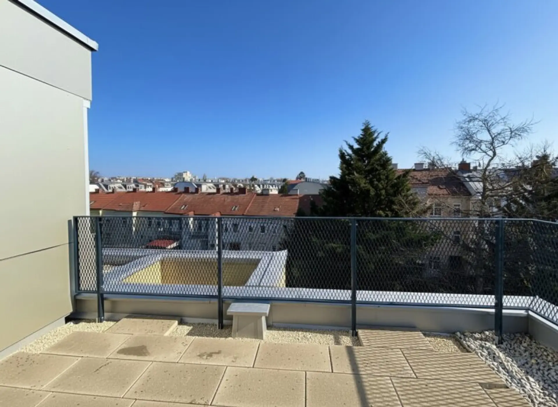 Die Freiflächen sind teilweise in den Innenhof gerichtet und teilweise zur Straßenseite, mit direkten Blick auf den Kahlenberg. Sie bieten geschützte, ruhige Rückzugsorte und schaffen private Wohlfühloasen zum Entspannen, Abschalten und Genießen.