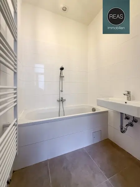 * 1 Badezimmer mit Badewanne, Waschbecken, Handtuchheizkörper sowie einer Oberlichte
